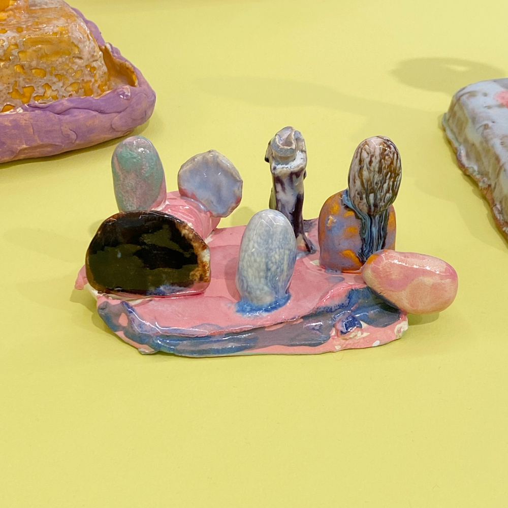 「花粉」は梅津さんの活動を語る上では重要な単語です。本展には出品されていない陶作品に「花粉濾し器」という作品があります。「花粉濾し器」は梅津さんが初めて作った陶作品で、左右非対称のテニスラケットが合体したような形状は、籐椅子に座った時の蒙古斑の接触面の形、ラケット、耳、フィルターなど、複合的で1つのイメージに偏らないよう考案された形状をしています。「蒙古斑」という単語は梅津さんが2013年に「であ、しゅとぅるむ」展 (名古屋市民ギャラリー矢田、2013) のカタログで発表したテキスト「優等生の蒙古斑」との繋がりを連想させます。「優等生の蒙古斑」とは美大合格を目指して通う予備校それぞれの表現の特徴が、美大に合格し、卒業して作家となり活動している時分にも根強く残っていることを指摘したものです (梅津さんの地元には美大受験予備校がなく、全国の予備校の入学案内カタログに掲載された「生徒による優秀作品」を手本としてデッサンを勉強していたため、作家〇〇さんはおそらくすいどーばた美術学院、というような予測が梅津さんには可能) 。また「花粉濾し器」の土台は量産品のフライパンを型にして制作されており、その後に制作される他の陶作品の土台が量産品のトレーなどから型を取っていることに繋がっていたりします。