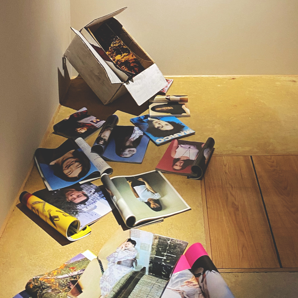 会場のLOKO GALLERYさんの地下にあるカフェスペースでのインスタレーション部分。段ボールから雑誌がこぼれ出しています。