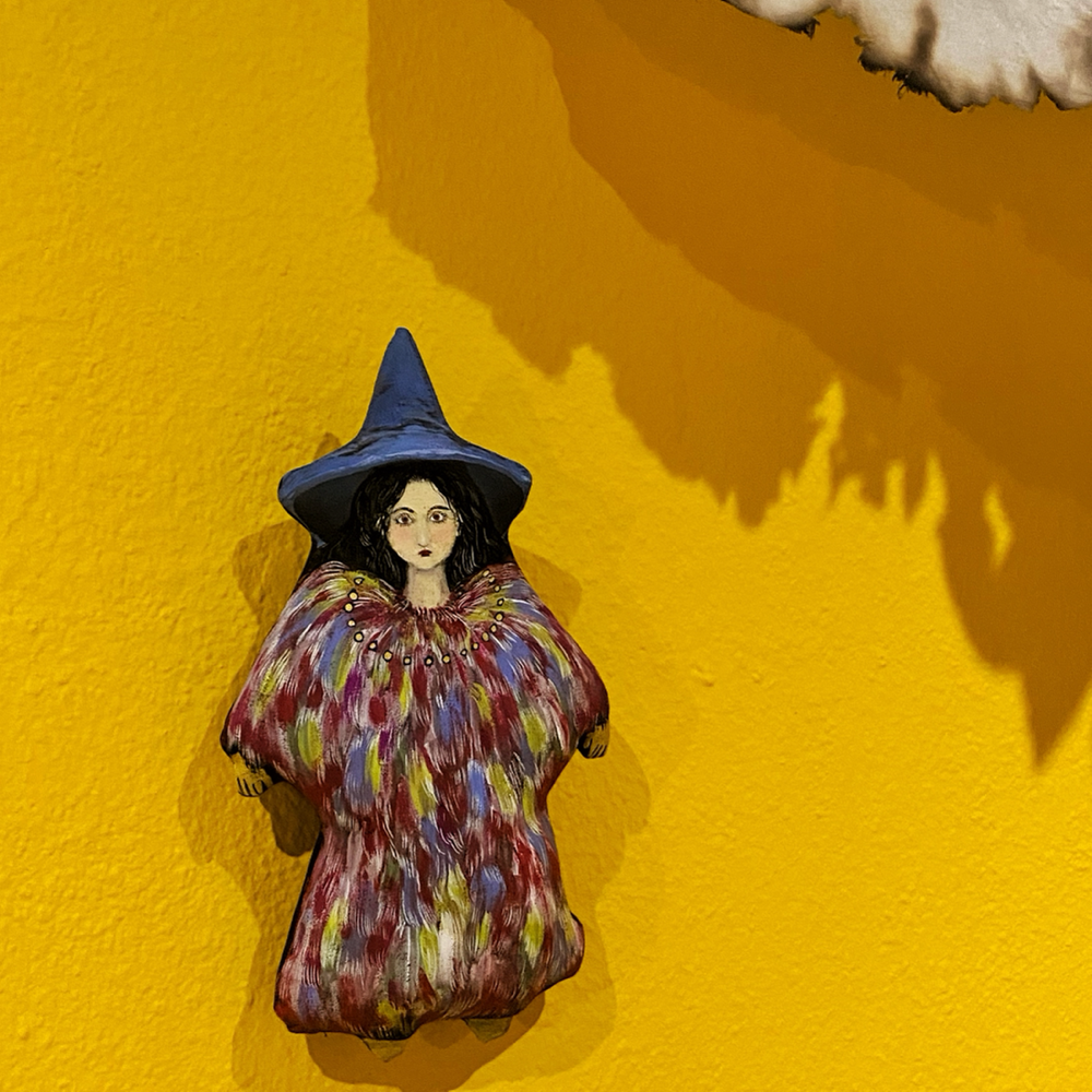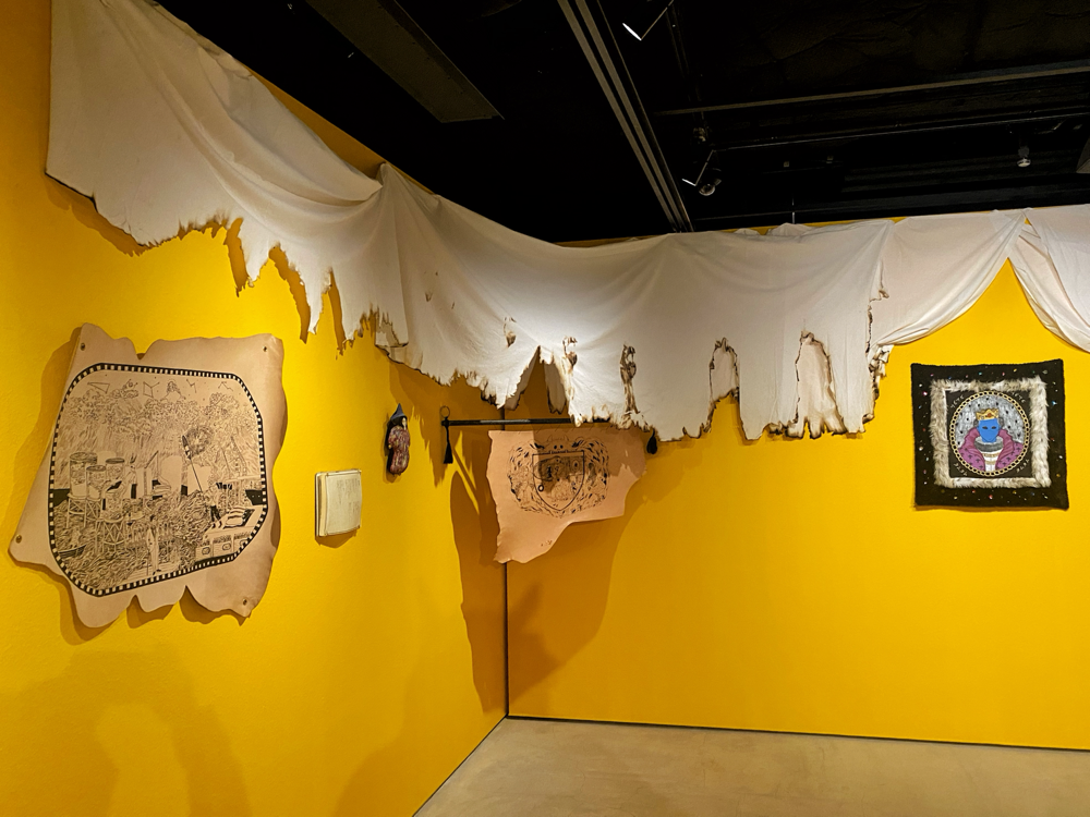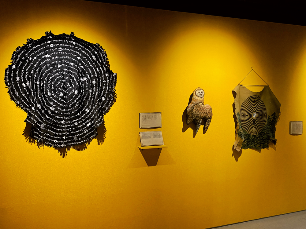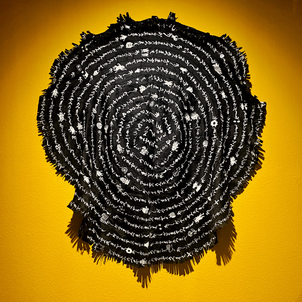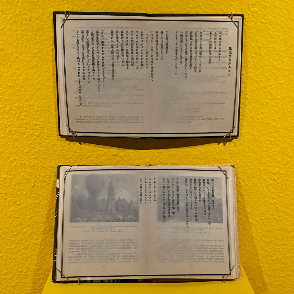 天牛美矢子さんは1989年生まれ、京都市立芸術大学大学院修了。ご実家が古書店という環境で育ち、物語や印字そのものの持つ「魔力」から発展した作品を制作されています。本展「偉大なるタムタム」は、展示空間全体で表現される呪術的な世界観が楽しめる展示ですが、深く観ていくと、今現在の私たちがまさに直面していて考えていかなければならない、厳しい現実に対する示唆が込められたものでした。
