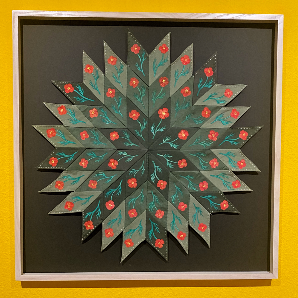 赤いけし (ポピー) の表すもの。第1次世界大戦の激戦区だったフランダースの野で、生い茂っていたのは赤いけしの花だったと言います。キルトになっている生地は軍服です。傷痍軍人が軍服を使用してパッチワークキルトを制作することに由来しているそうです。