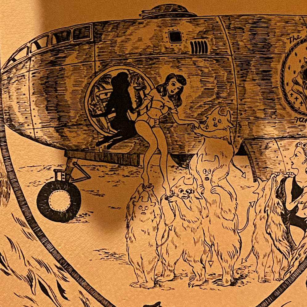 髑髏やデーモンが見えますが、書かれている呪文のようなものは「ほしがりません かつまでは」です。言わずと知れた、第二次世界大戦中の日本でよく唱えられた「国策標語」の一つで、意味は、戦争に勝利するまでは、ぜいたくしない (欲しがらない) というものです。