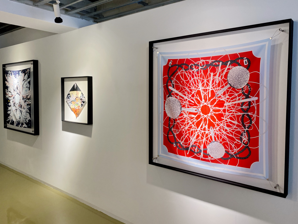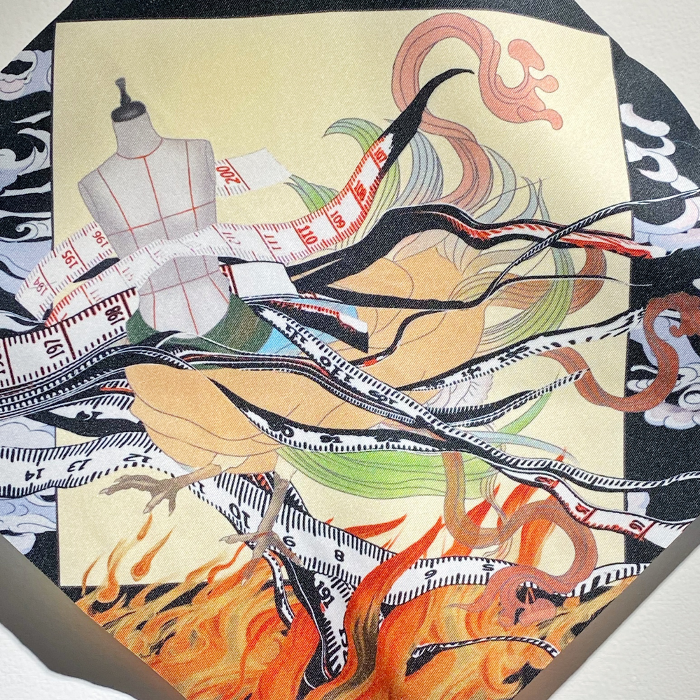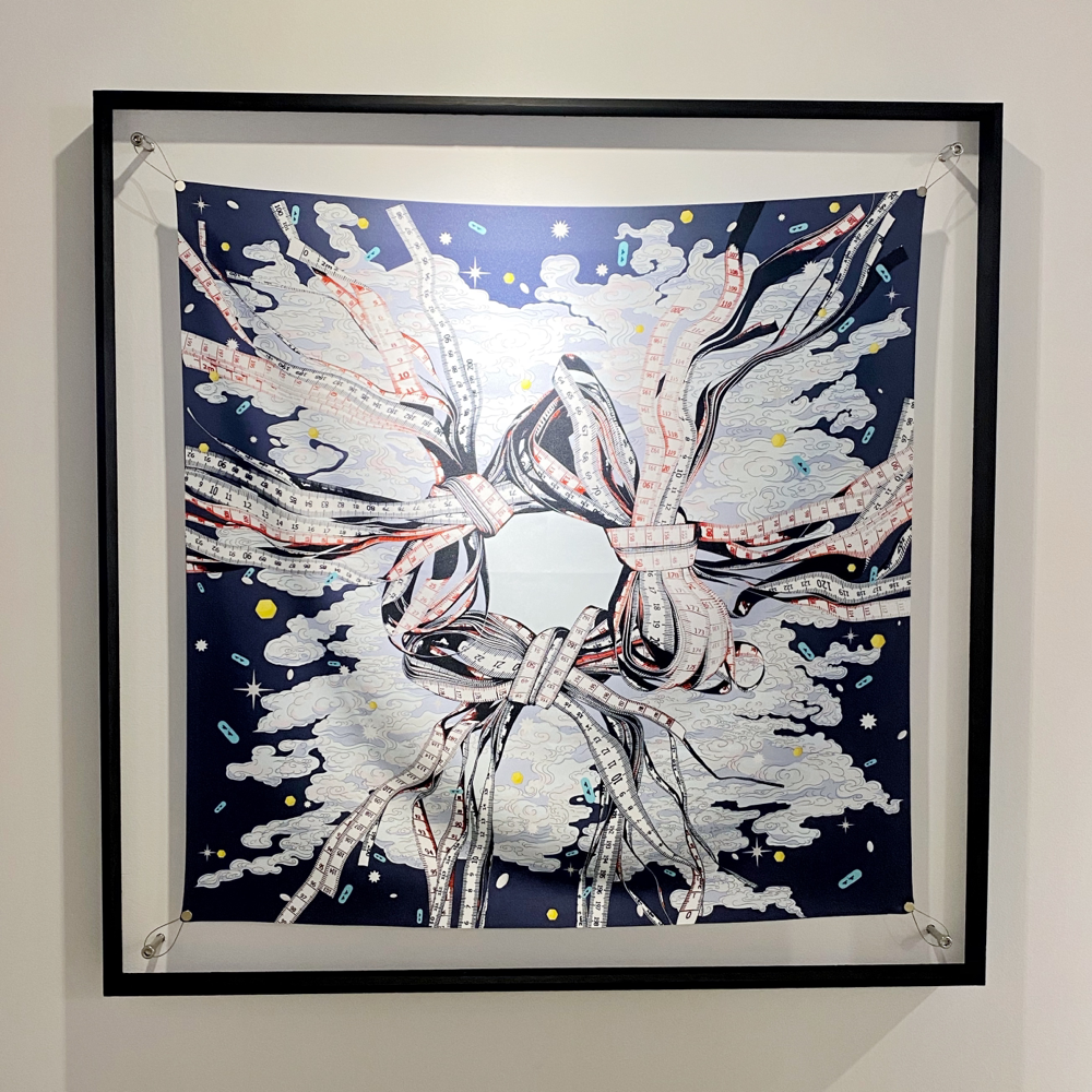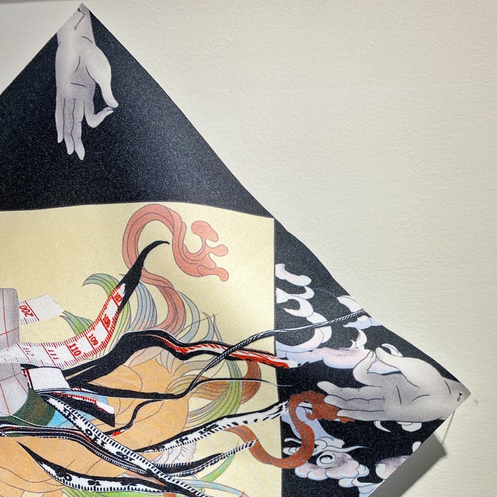 高橋鮎子さんは1994年生まれ、多摩美術大学美術学部油画専攻卒業、パリ国立高等美術学校交換留学、東京藝術大学大学院美術研究科油画専攻修了。本展「Kalavinka」では「ルッキズムとその周辺について」を主題にスカーフやネックレスなどの首飾りに着想を得た新作を中心に発表されています。「近年、エルメスの開発した「ハンギング・システム」が人口に膾炙し、スカーフを壁に吊り下げて飾るカルチャーが広がりを見せています。(TAV GALLERY 展覧会リリースより 抜粋)」という部分に、過去に額装スタッフとして働いていた時、エルメスのスカーフを何枚か額装した際の私的な思いとリンクするものを感じ取り、伺ってきました。