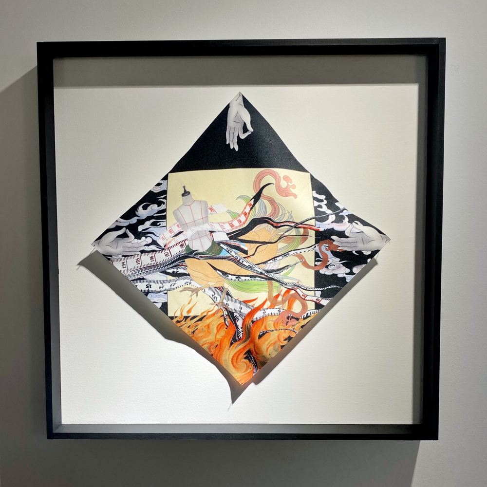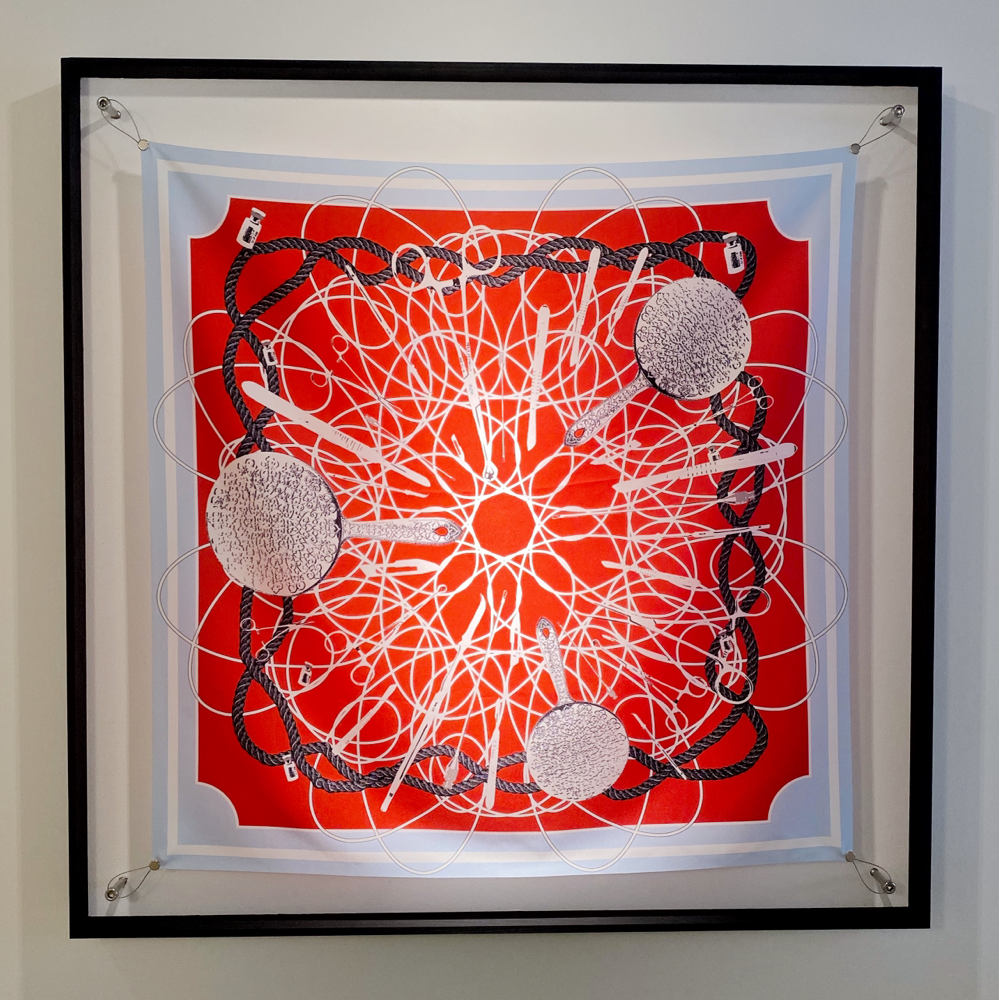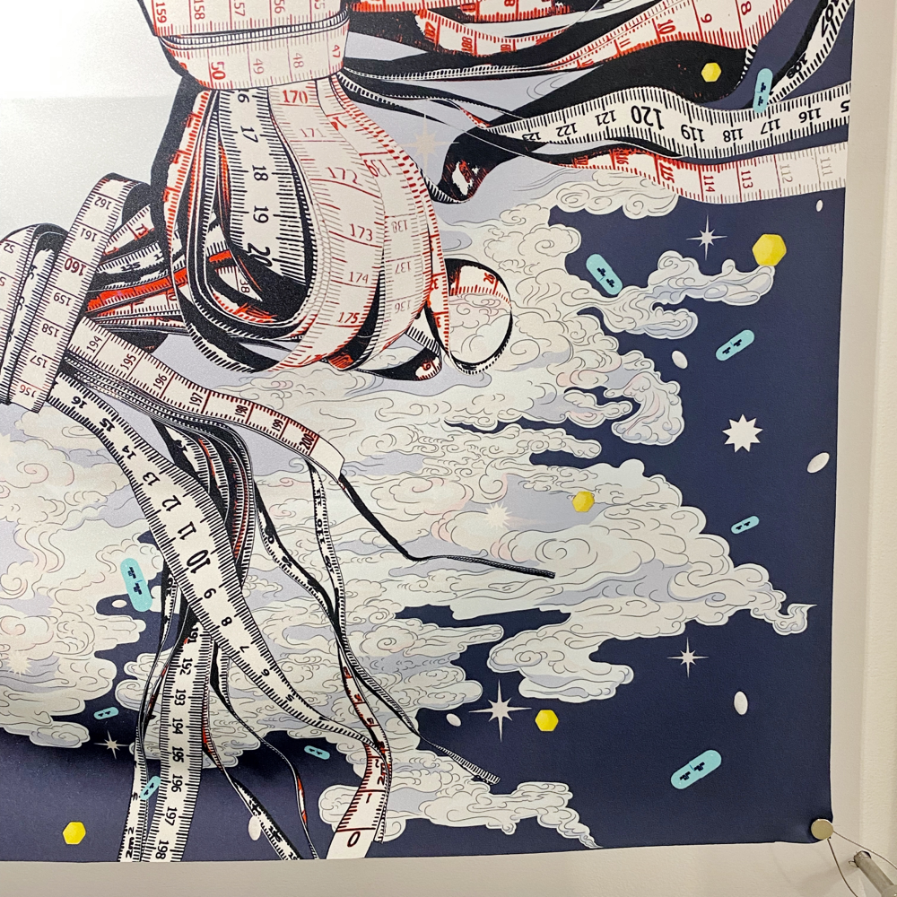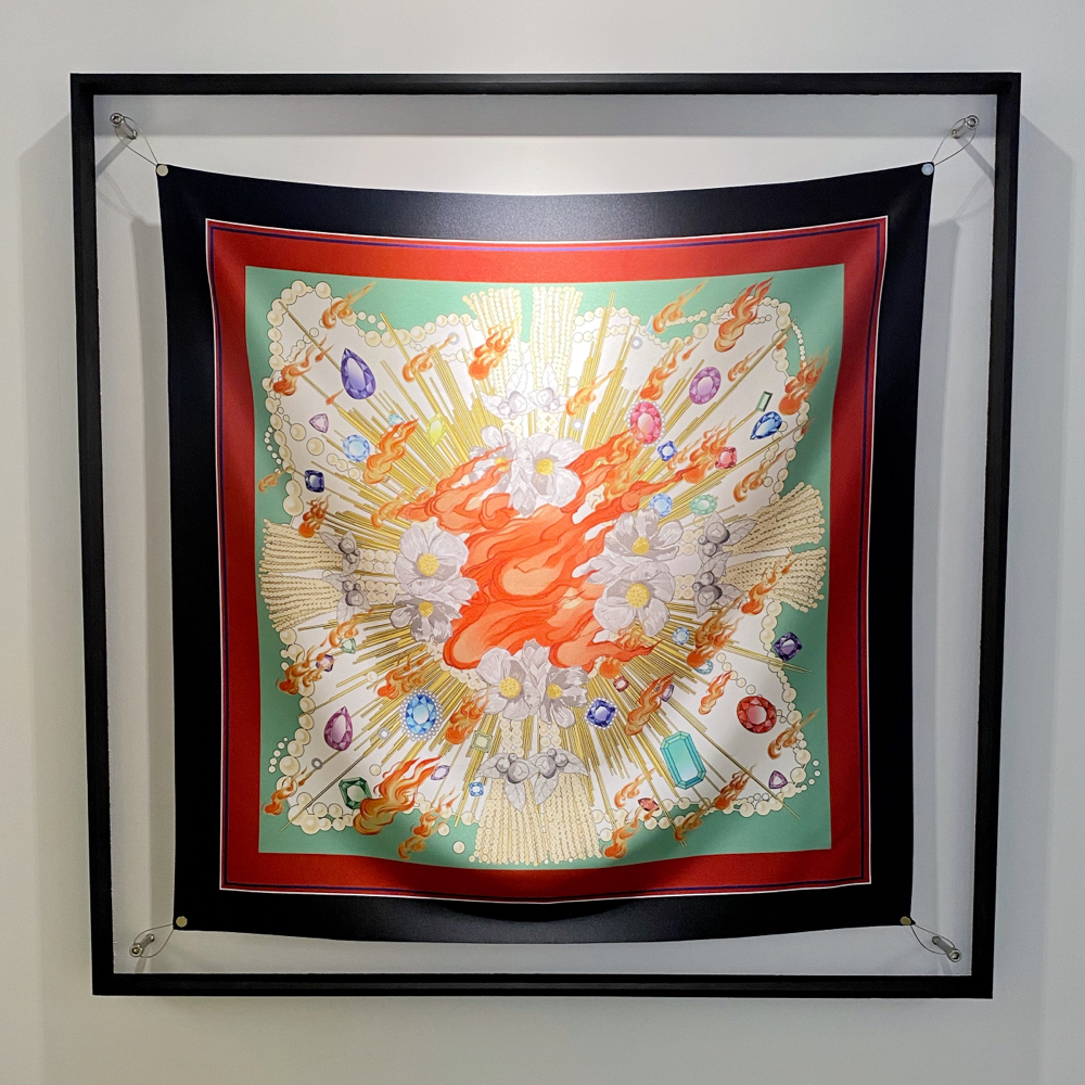 高橋鮎子さんは1994年生まれ、多摩美術大学美術学部油画専攻卒業、パリ国立高等美術学校交換留学、東京藝術大学大学院美術研究科油画専攻修了。本展「Kalavinka」では「ルッキズムとその周辺について」を主題にスカーフやネックレスなどの首飾りに着想を得た新作を中心に発表されています。「近年、エルメスの開発した「ハンギング・システム」が人口に膾炙し、スカーフを壁に吊り下げて飾るカルチャーが広がりを見せています。(TAV GALLERY 展覧会リリースより 抜粋)」という部分に、過去に額装スタッフとして働いていた時、エルメスのスカーフを何枚か額装した際の私的な思いとリンクするものを感じ取り、伺ってきました。