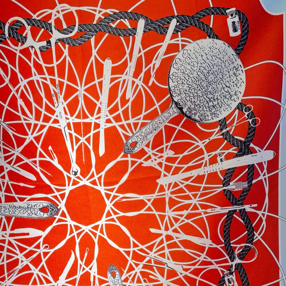 壁飾りとしてのスカーフは、鹿頭の剥製に代表される「ハンティング・トロフィー」にも似ています。本来であれば首に巻きつけて使用するはずのスカーフが、広げられた状態で吊り下げられている光景は、見せしめに磔にされた晒し者、あるいは、切り開かれて吊されている屠殺された牛の姿を想わせ、凄惨に映るかもしれません。