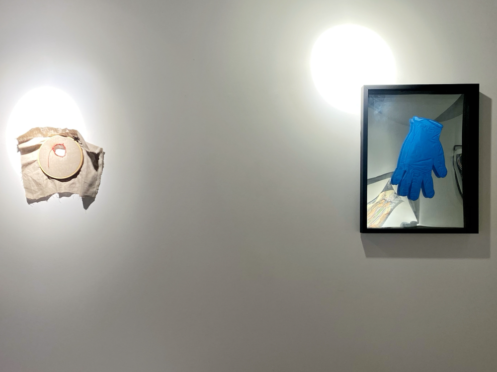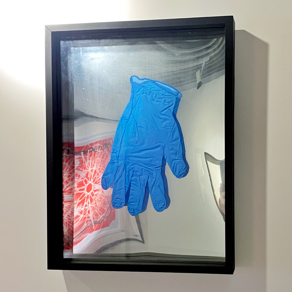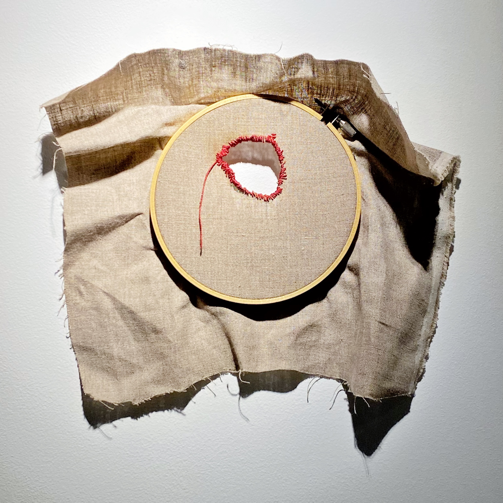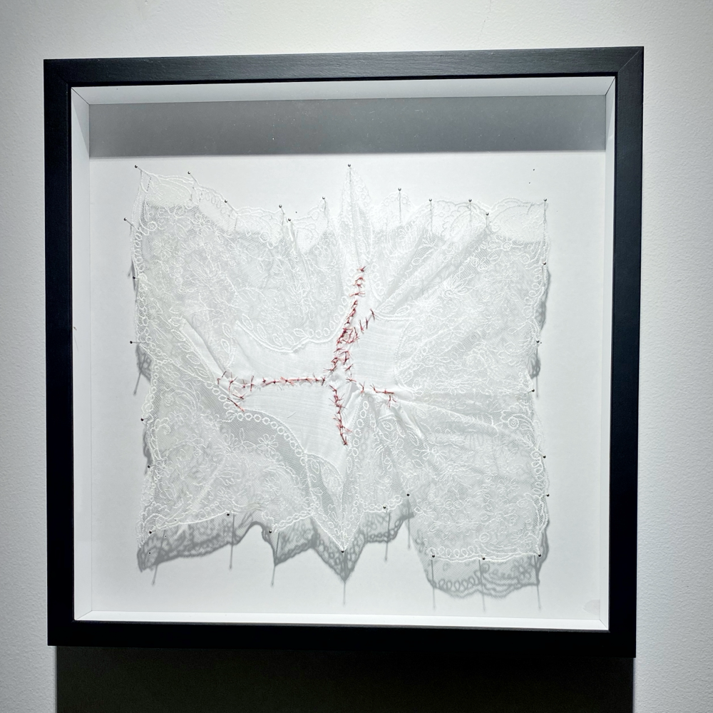 繊細で美しいレース生地が、赤くてキラキラした、少し固そうな糸で補修されています。一つ一つ結び目を作って繕っている「結節縫合」ですね。傷口を丁寧に治したいということのようですが結構ツレてます。虫ピンで留められているのも標本らしく、見せることを目的にしているようにも思えます。「はらわた」と読む時、こころ、性根、胸中、物ごとの神髄、すばらしい様子、などの意味があります (参照:コトバンク 精選版 日本国語大辞典「腸」の解説) 。美を追求していく過程で心に受けた傷跡、という風にも見えます。