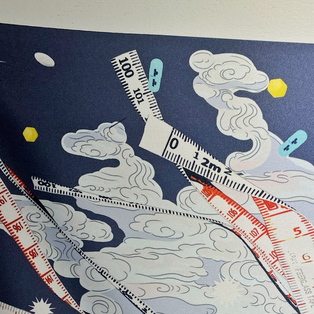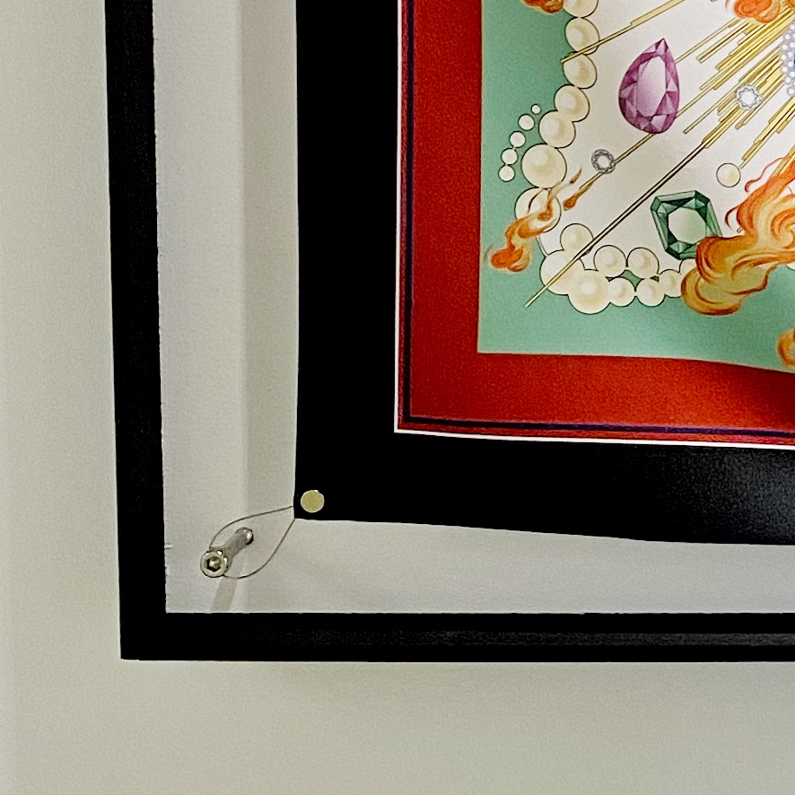 まずその私的な経験を詳しく書きたいと思います。額装の仕事では、絵画作品以外のものを額に入れたいという要望は多く、エルメスのスカーフを飾りたい、という要望もけっこう多いのです。エルメスが販売している「ハンギング・システム」(マグネット式のワイヤーフック。磁石で四隅を挟み、引っ張って吊るすように飾るシステム、取り外せばスカーフとして使用が可能。この「ハンギング・システム」も、購入者側の飾りたいという要望から生まれたものかも知れません) というものもあるのですが、それを用いて「吊るす」のではなく、ピシッとシワなく伸ばされた平面作品のようにスカーフを飾りたいという要望があるのです。エルメス側としても「額装」は推奨しているわけではないようですが、そういった要望があれば、額装の専門店を案内するしかないようです。実際問題としてスカーフを平面作品のように額装することは容易ではなく、ピシッとシワなくするためには、スチレンボードなどの平面にスカーフの端を数ミリ巻き込んで裏側や側面で額装用のテープを用いて留める、という作業が必要で、これは難易度の高い作業です。シルクの素材は伸びやすいため過度に引っ張ってしまうとヨレの原因になり、手の微妙な感覚でシワを伸ばしながらヨレなく、しかも描かれているデザインに影響なく張り込まなければなりません (デザインの中の直線が、引っ張る力の微妙な違いにより容易にうねった線に変わってしまうのは想像していただきやすいかもしれません。スカーフは織りの方向や保管状況などにより、もとの真四角に近い状態をキープ出来ないのです) 。隅の部分もある程度テンションをかけて伸ばさなければピシッとした平面にならないのでスカーフの形が変わりますし (これもキャンバスを張ったことのある方は容易に想像出来るかもしれませんが、まず十字方向にテンションをかけて止め、隅は初めは仮留めし最後に引っ張って留めることでピンと張った平面が出来あがります) 、テープを用いることもあって、一度額装してしまえば、スカーフとして身体に巻いて使うことは出来なくなります。それらを了承した上でも「額に入れて飾りたい」という要望はあり、新品で買った (決して安くはない) スカーフにわざわざアイロンをかけて持ち込んでくださる方も多く、それほどまでにスカーフに描かれているデザインや絵が作品として好きなんだな、と感心する一方、エルメスのスカーフでなかったら飾らないのでは?という穿った見方をしてしまっていたのも事実です。なぜなら、布地等の額装は、依頼者本人が刺繍した作品や思い出の品の場合が多く、新品のスカーフの額装はエルメス以外に受注したことがありません。