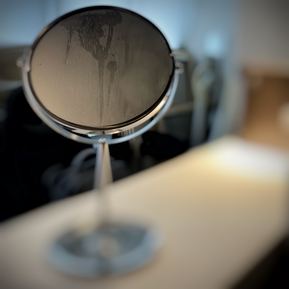 この鏡も曇っていて、ありのままの私を詳細に写しません。最高か。