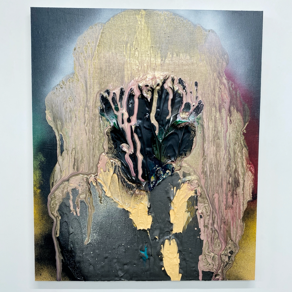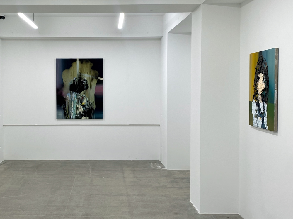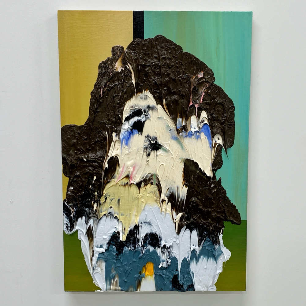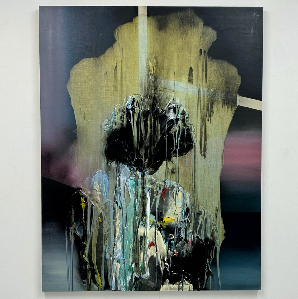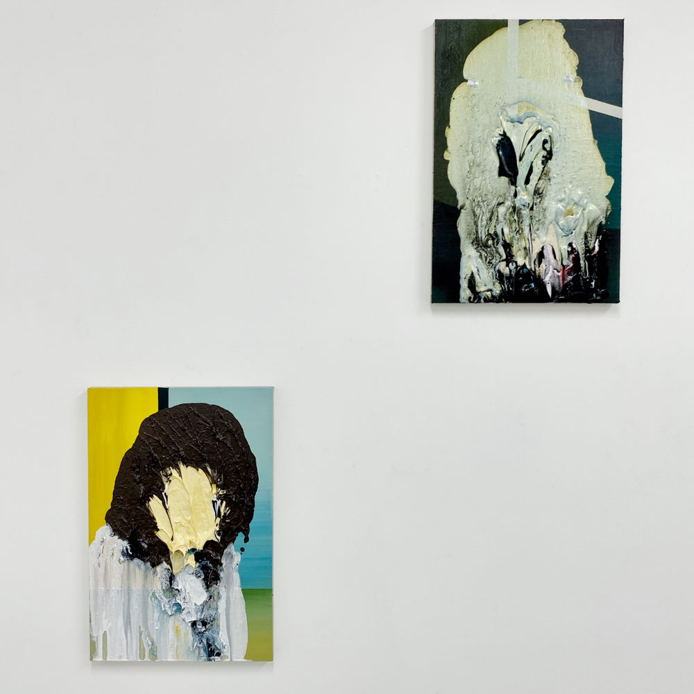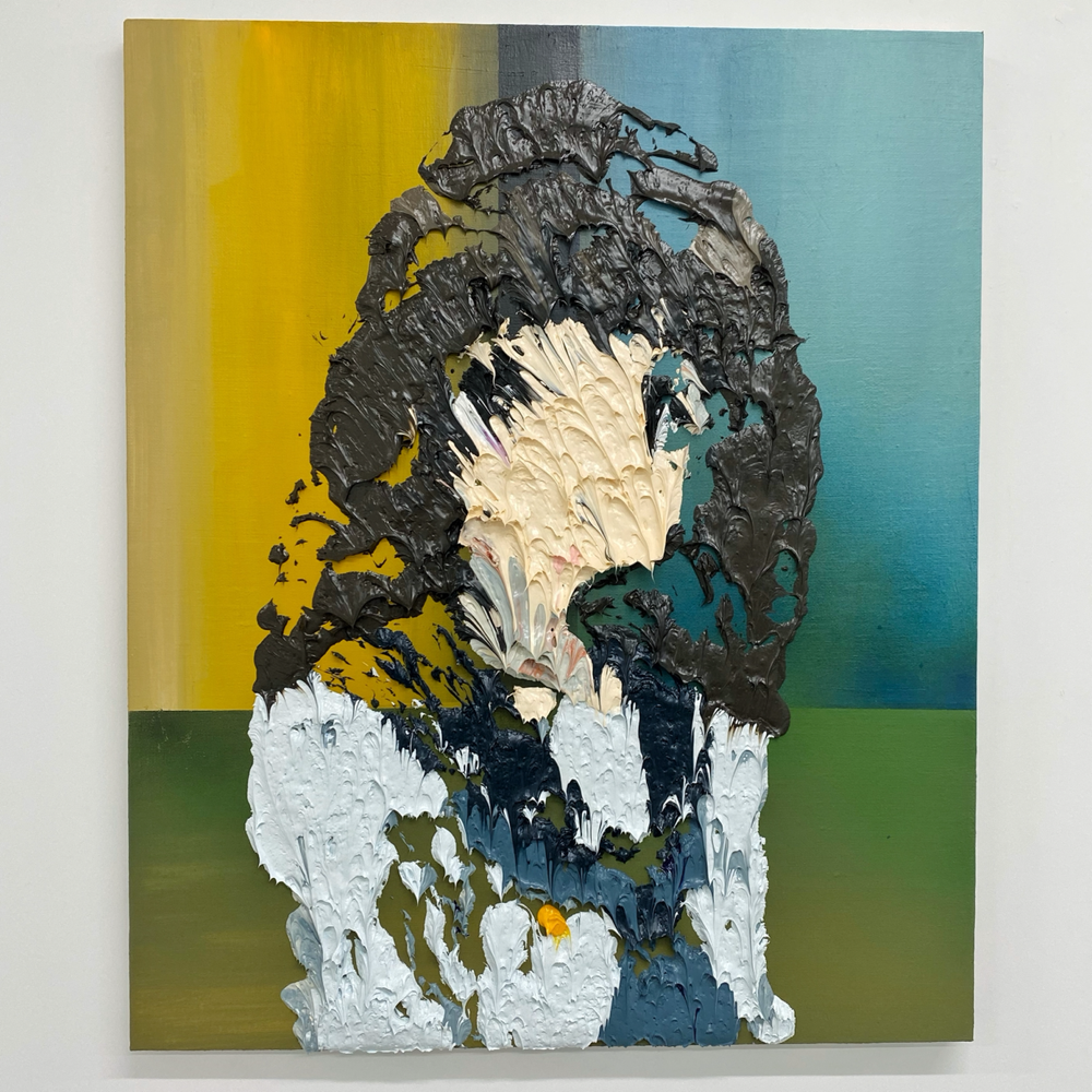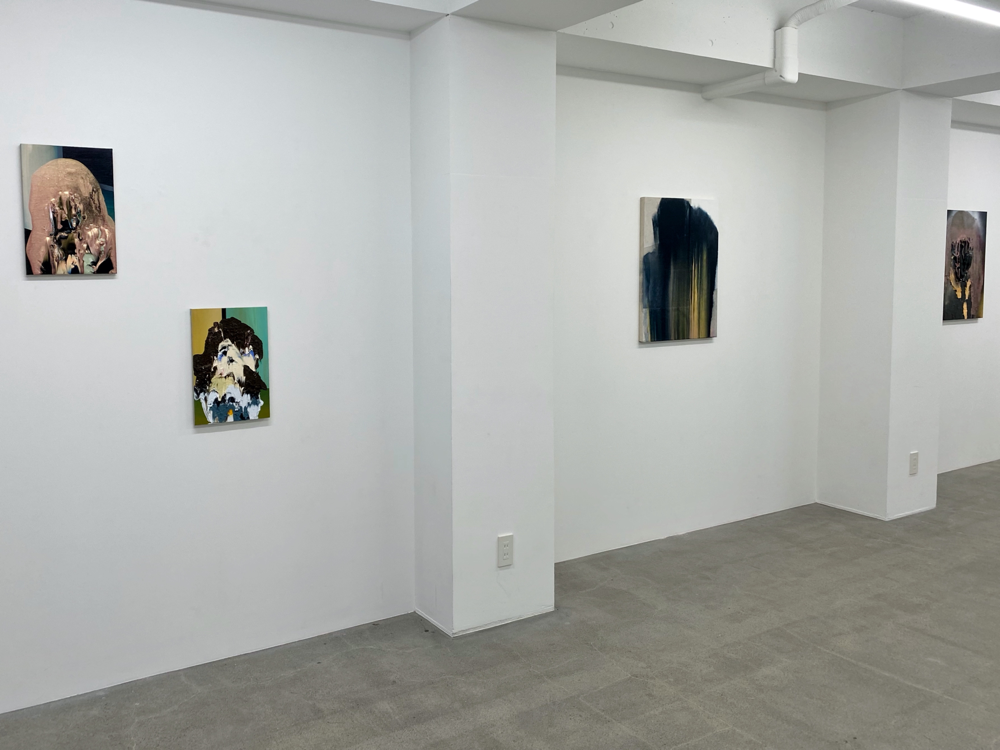 西村昂祐さんは1999年生まれ、大阪教育大学芸術表現専攻卒業、2022年より東京藝術大学大学院油画第六研究室。デカルコマニーという手法を用いて、大衆に知られているイメージが変形していくさまを、絵の具の物質感を伴って表現しています。