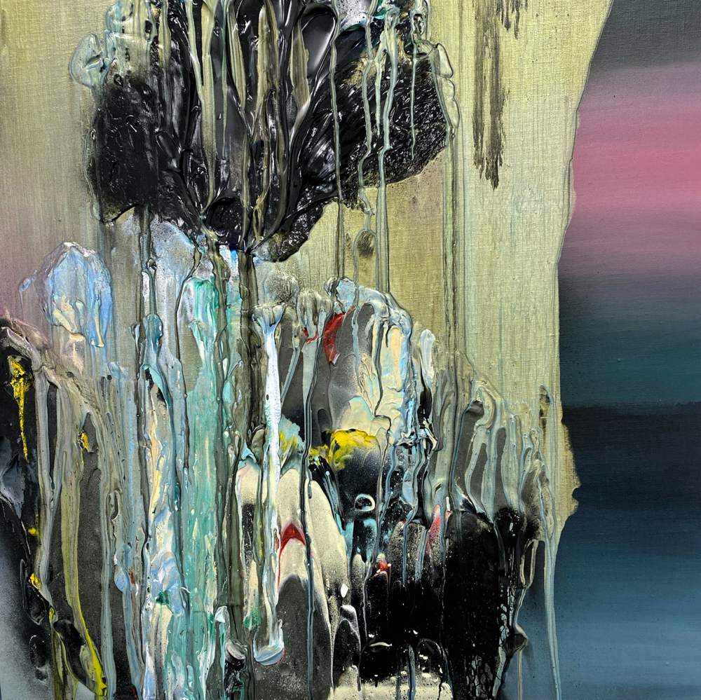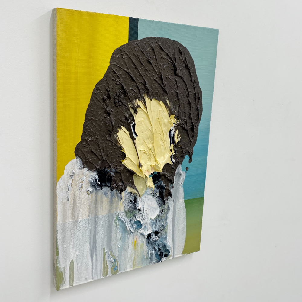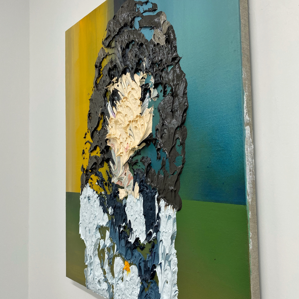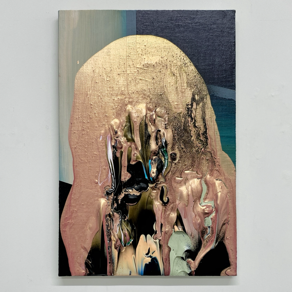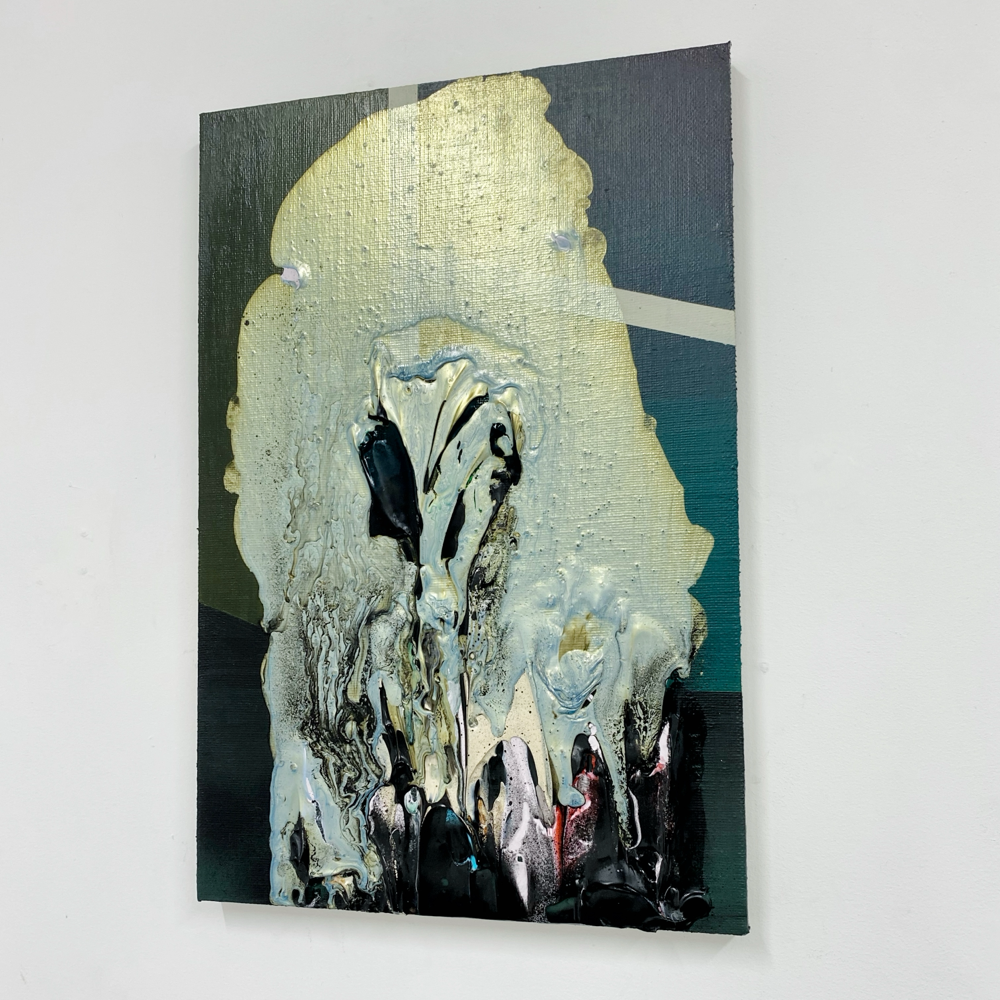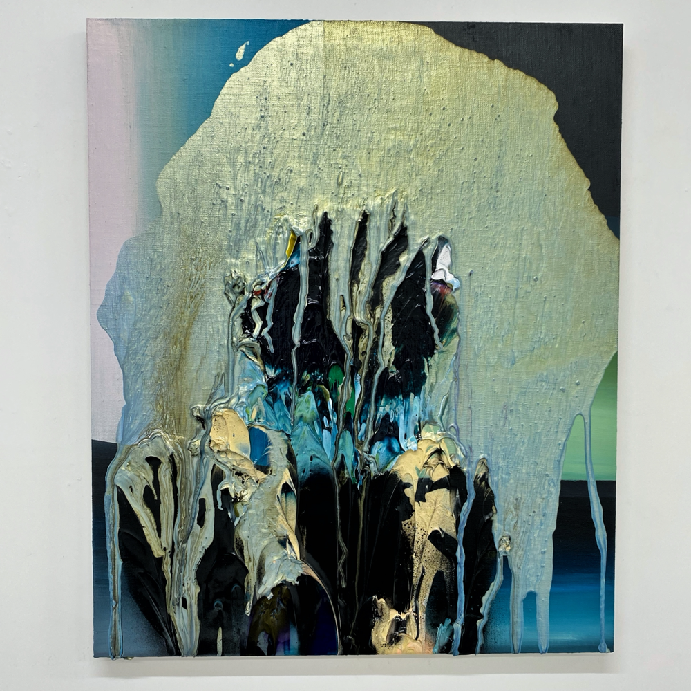 西村昂祐さんは1999年生まれ、大阪教育大学芸術表現専攻卒業、2022年より東京藝術大学大学院油画第六研究室。デカルコマニーという手法を用いて、大衆に知られているイメージが変形していくさまを、絵の具の物質感を伴って表現しています。