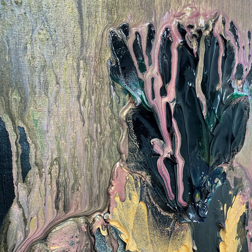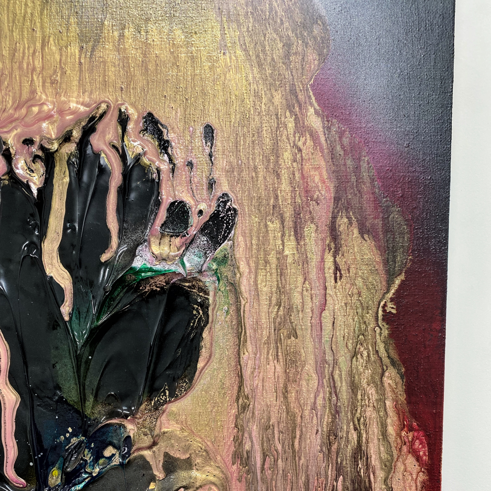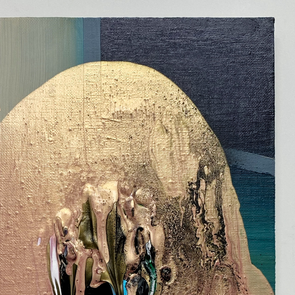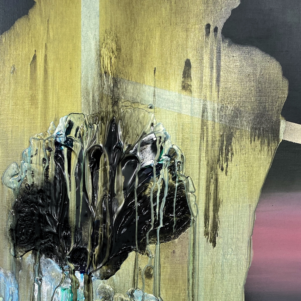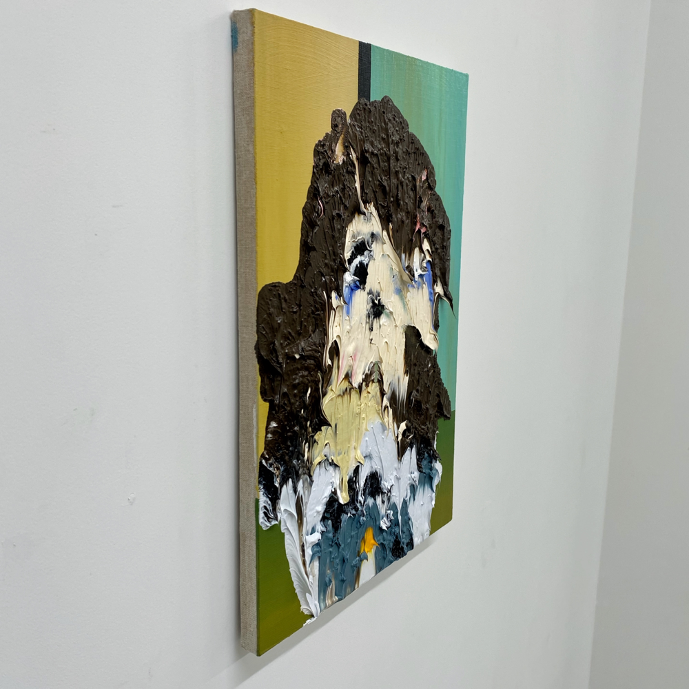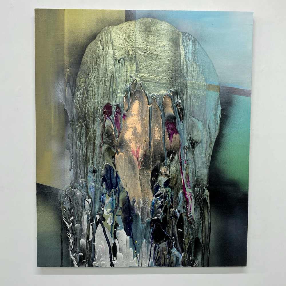 西村昂祐さんは1999年生まれ、大阪教育大学芸術表現専攻卒業、2022年より東京藝術大学大学院油画第六研究室。デカルコマニーという手法を用いて、大衆に知られているイメージが変形していくさまを、絵の具の物質感を伴って表現しています。