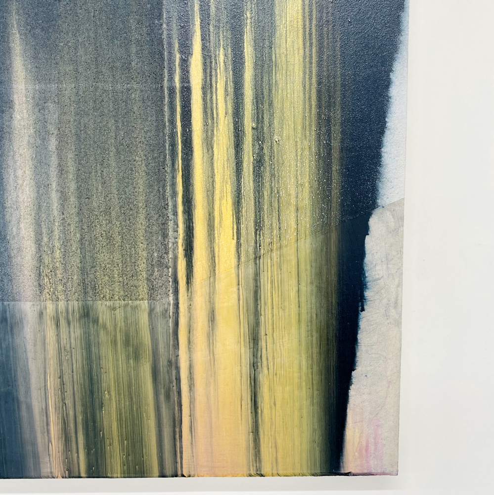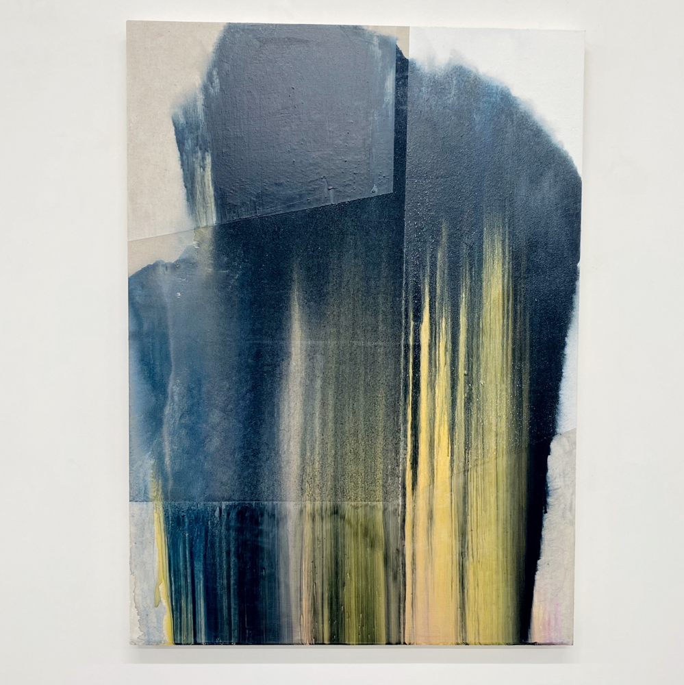 デカルコマニーとはなんぞや、ということですが、フランス語で「転写」を意味する言葉で、小さい頃にやった「半分に折った紙の片側に複数色の絵の具を多めに置き、閉じて圧力をかけて開くと幻想的な模様が現れるアレ」もデカルコマニーです。美術史的には、作家の作為よりも偶然性を重視し自動筆記なども用いた「シュルレアリスム」の流れで、オスカー・ドミンゲス (1906 - 1957) によって絵画に導入されました。西村さんの場合は、元のイメージをプリントしたものに絵の具を載せ、別の支持体に転写する方法を採っています。以前の作品で用いられた元イメージには、モナ・リザであったり、写楽の浮世絵だったり、ドラ○もんやサザ○さんのアニメのシーンなどがありました。デカルコマニーの方法自体に「複製」に近いものを感じ、イメージが複製され消費されていくことにより変形していく現象と自身の制作を重ね、そういった、広く認知された元イメージを選定していたそうです。