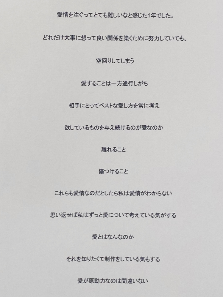 ステートメントを読むと、佐々木さんが経験した出来事を通して「愛情」についてさらに深掘りして考える日々の中で生まれた作品群ということが分かります。