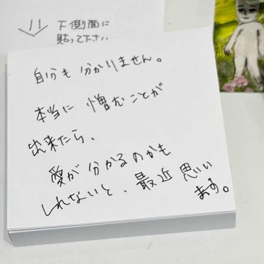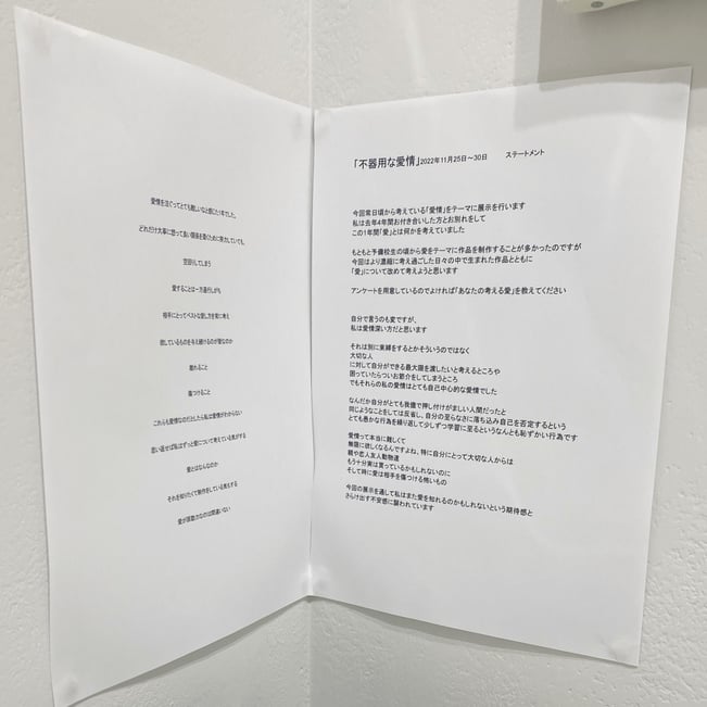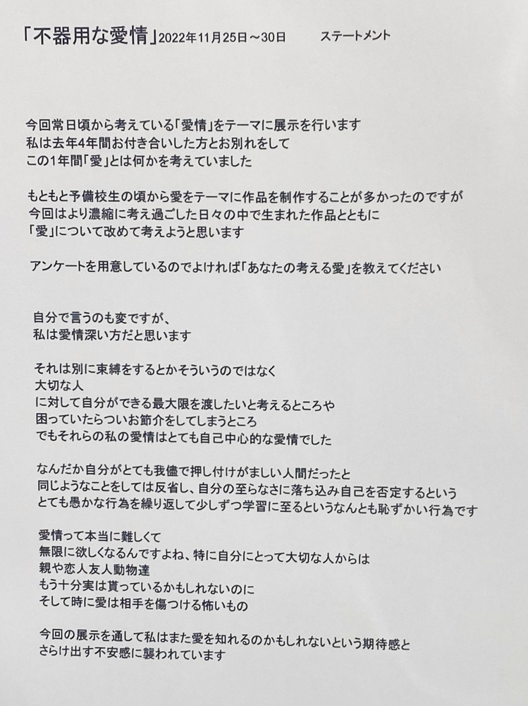 ステートメントも掲示されていました。「愛情」がテーマということです。むむむ、難しいテーマ。容易に答えが出ないものだからこそ、佐々木さんの今後も含んだ作家活動全体の軸となるテーマのようです。