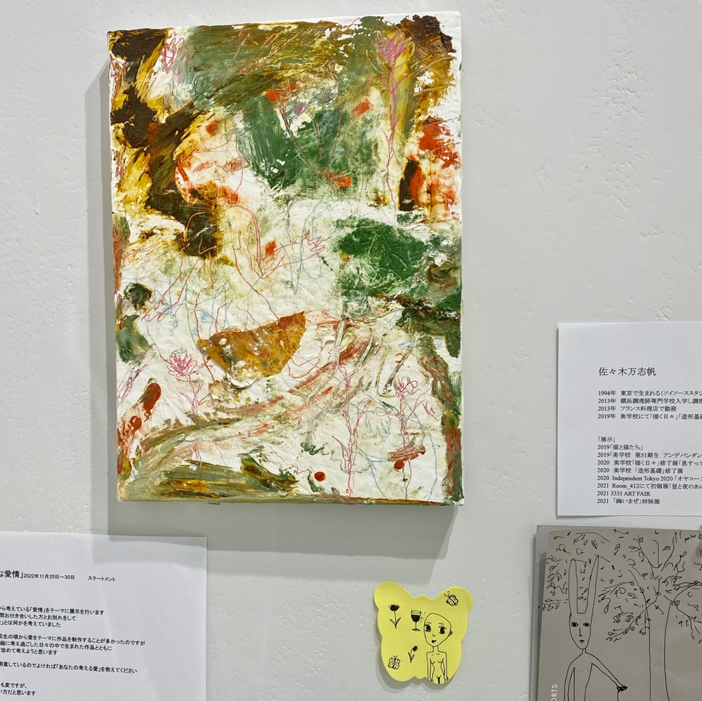 「愛情」というなかなかに難しいテーマの展示でしたが、絵の表現そのものに、混乱している様子や不明瞭さ、苦悩といったものが表れているような作品群だと感じました。佐々木さんの作品制作のスタイルは、人生そのものを私小説的に表現していくことなのかも知れません。今後、「愛情」というものがどうなっていくのか、この展示の後はどんな変化があるのか、気になります。