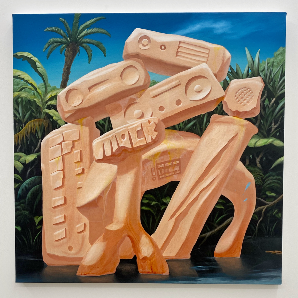ラジカセなどのモチーフが確認出来ます。80年代〜90年代くらいの文化が未来で発掘されたようにも見える。未来から見たら、これは例えばストーンヘンジのように、何か謎のモニュメントに見えるのかも。背景がジャングルっぽいのも気になります。発展した文明がリセットされた未来でしょうか。