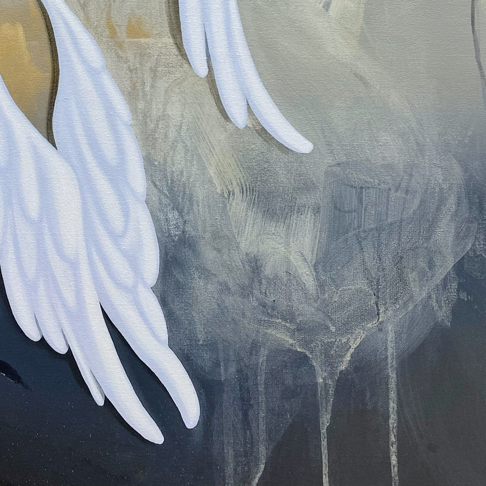 抽象っぽく見える背景が実在していて、具体的な形を有しているクリーチャー、すなわち、この2作品ではタイトルからseraphim (セラフィム = 熾天使。六枚の翼を持つ。参考:イザヤ書 第6章 2。「熾」は「火が盛んに燃える」の意。) という天使なんですが、それは実存しているものではない、というところがとても興味深いです。実存していない、とか言い切っちゃうと信じている人は気を悪くするかも知れませんが、、、。この作品では「実際に存在する抽象画」に出会わせてくれた目に見えない存在に対して、高木さんが「天使を見た」というような印象を得たのかな、と勝手に想像しました。エモい。