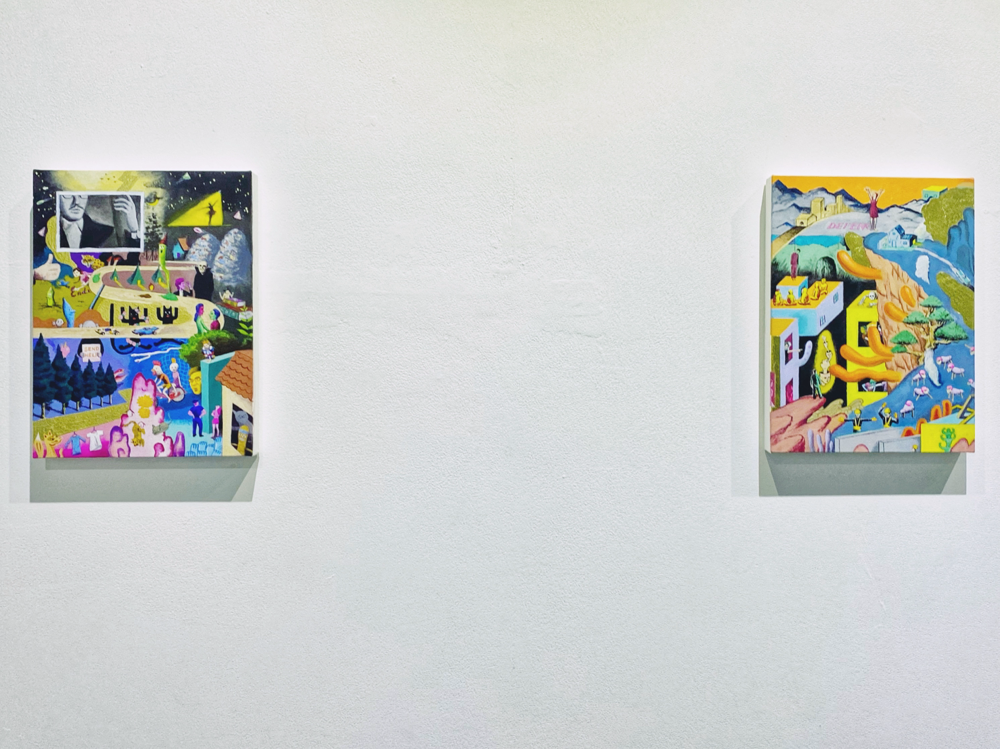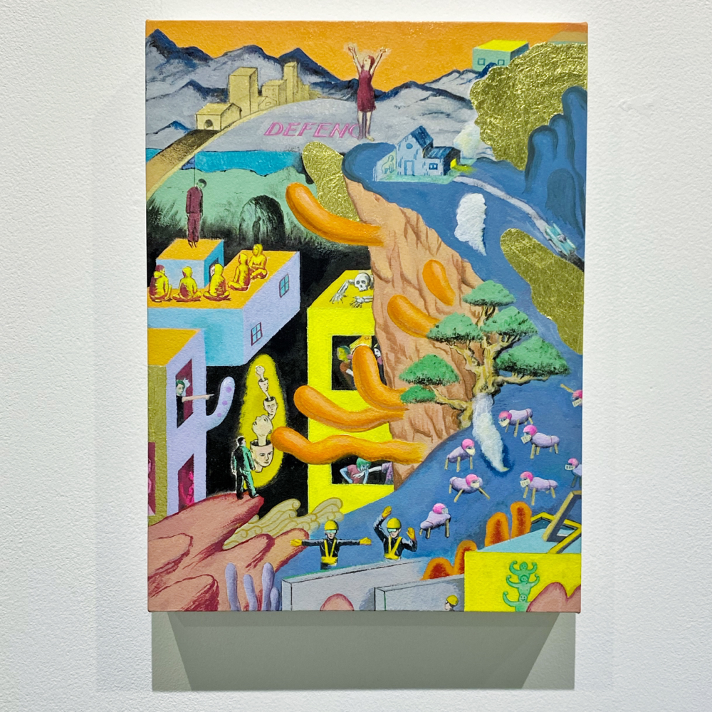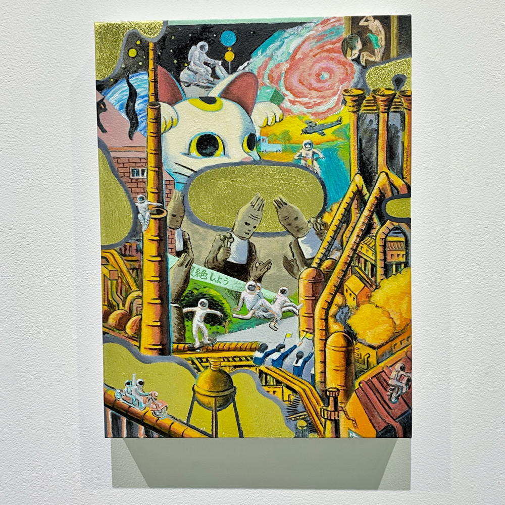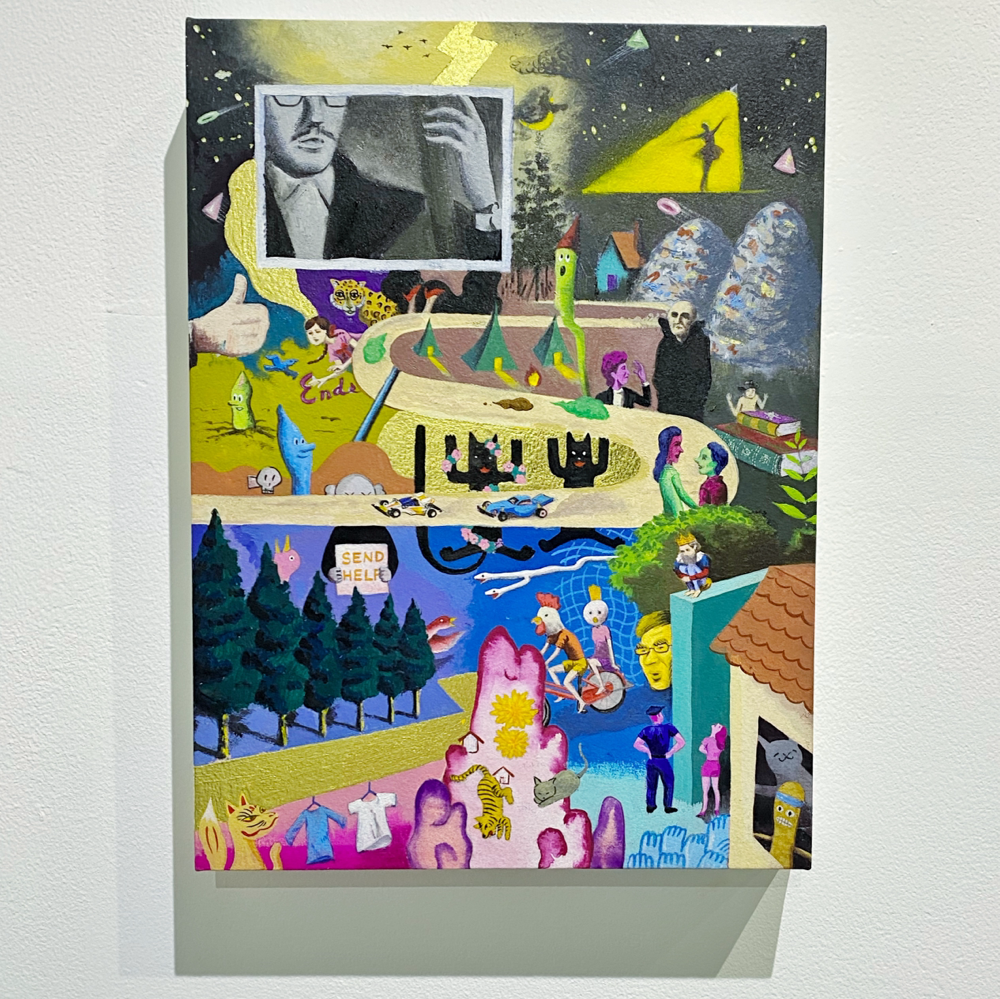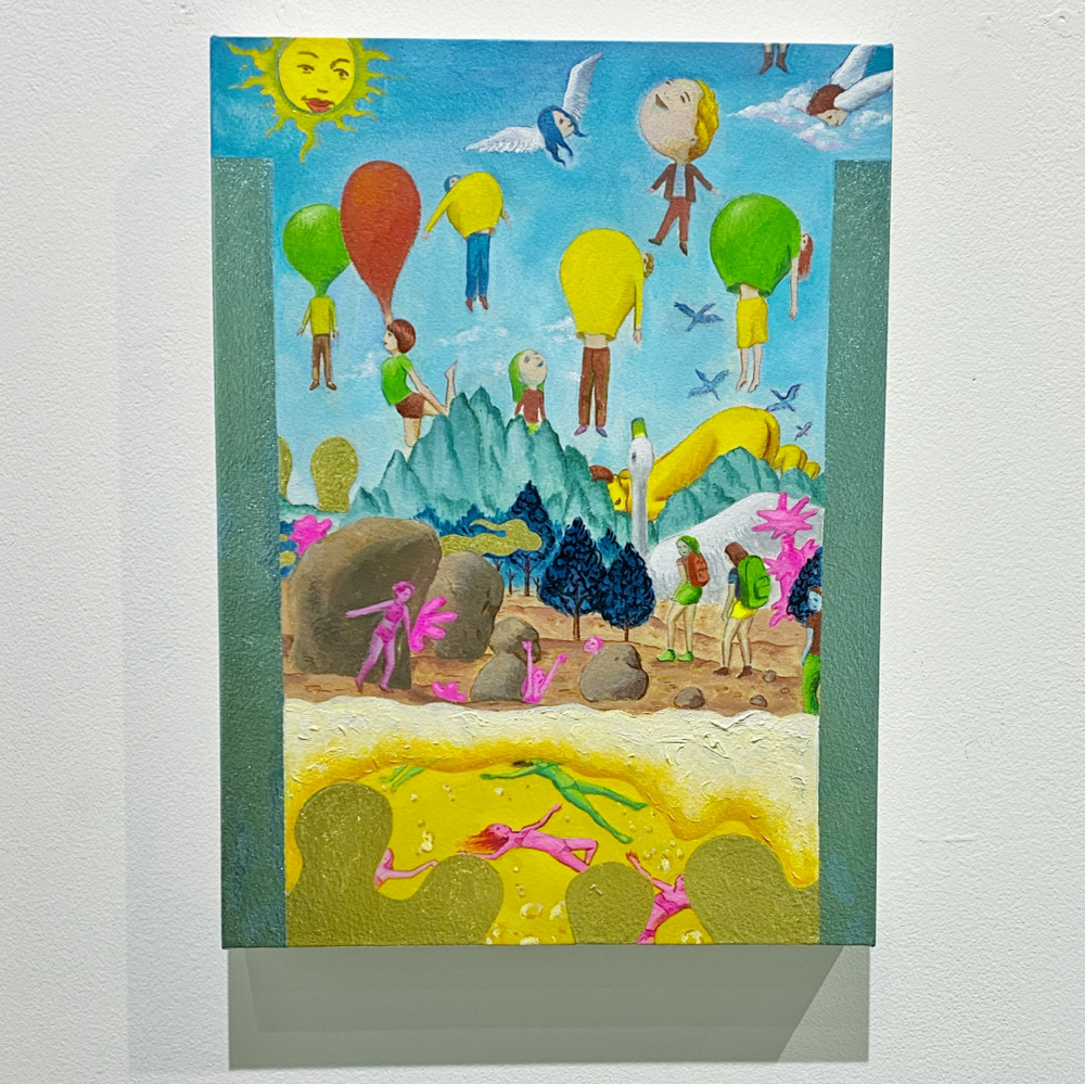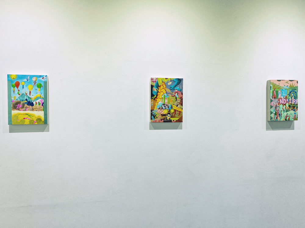 本展「風の強い空と捕虫網と虫眼鏡」では、日常的に集積された視覚的・聴覚的情報や記憶を再構築し表出した作品群が展示されています。印象に残った事物を、一度メモのような簡単なものに置き換え、後からその記憶を呼び起こすというプロセスを経て描かれた作品群は、ヒエロニムス・ボスの「快楽の園」のような異世界の群像画のようにも、日本のサブカルチャー誌の表紙に見られるような想像上のコミカルな表現にも、遠近法を用いず重要なものを大きく描いた後期ゴシック〜初期ルネサンス期の画家たちの作品のようにも感じられ、人によって受ける印象が異なる不思議な世界観を形成しています。