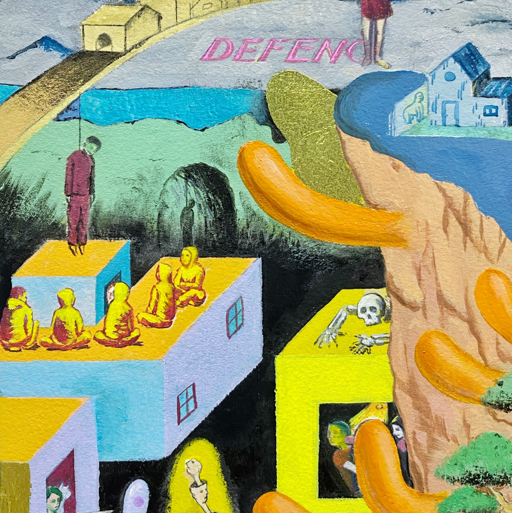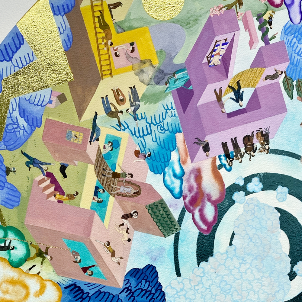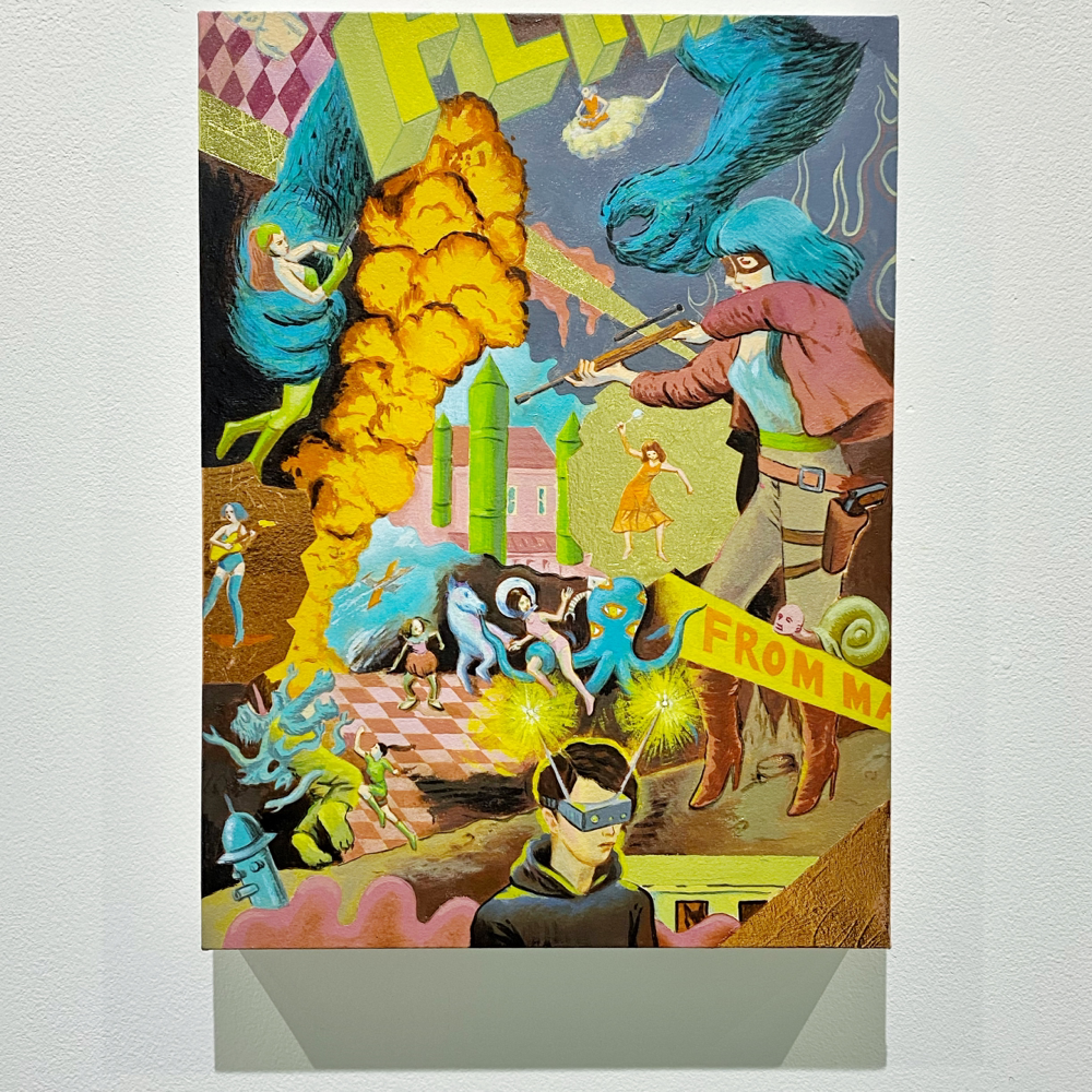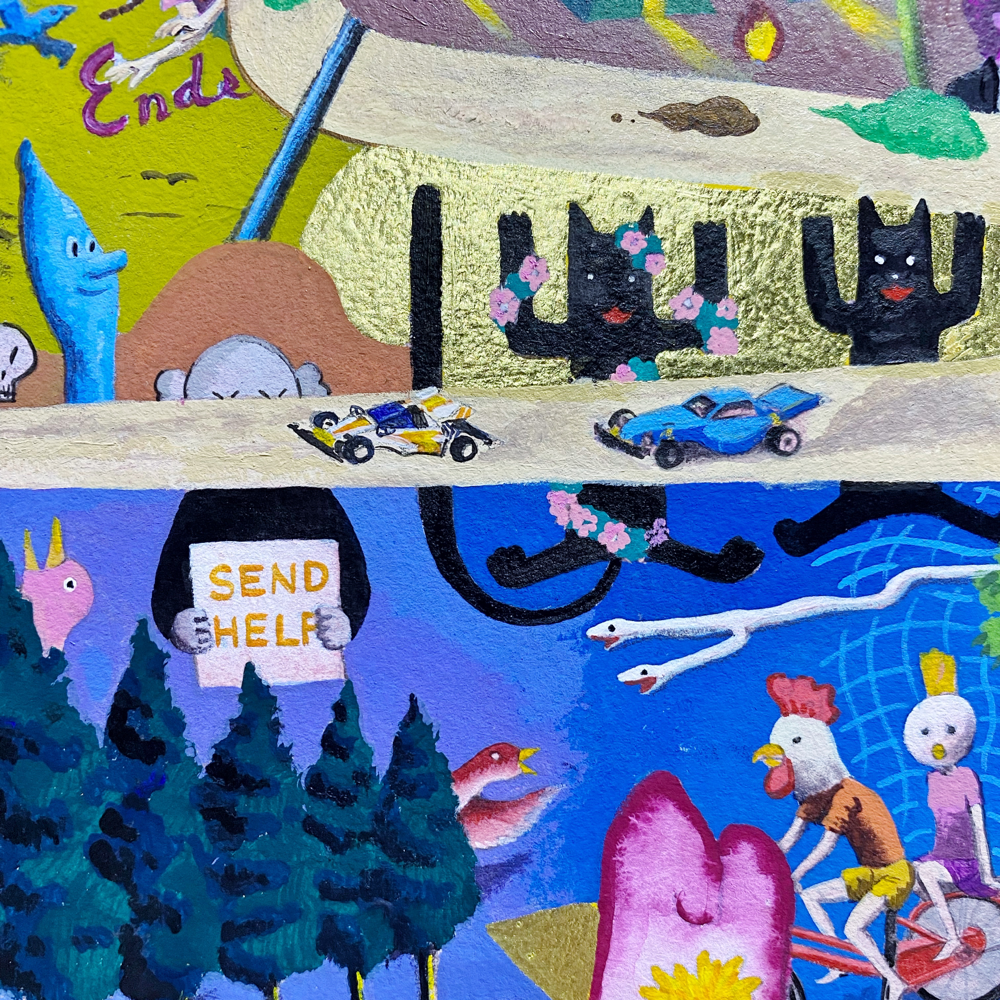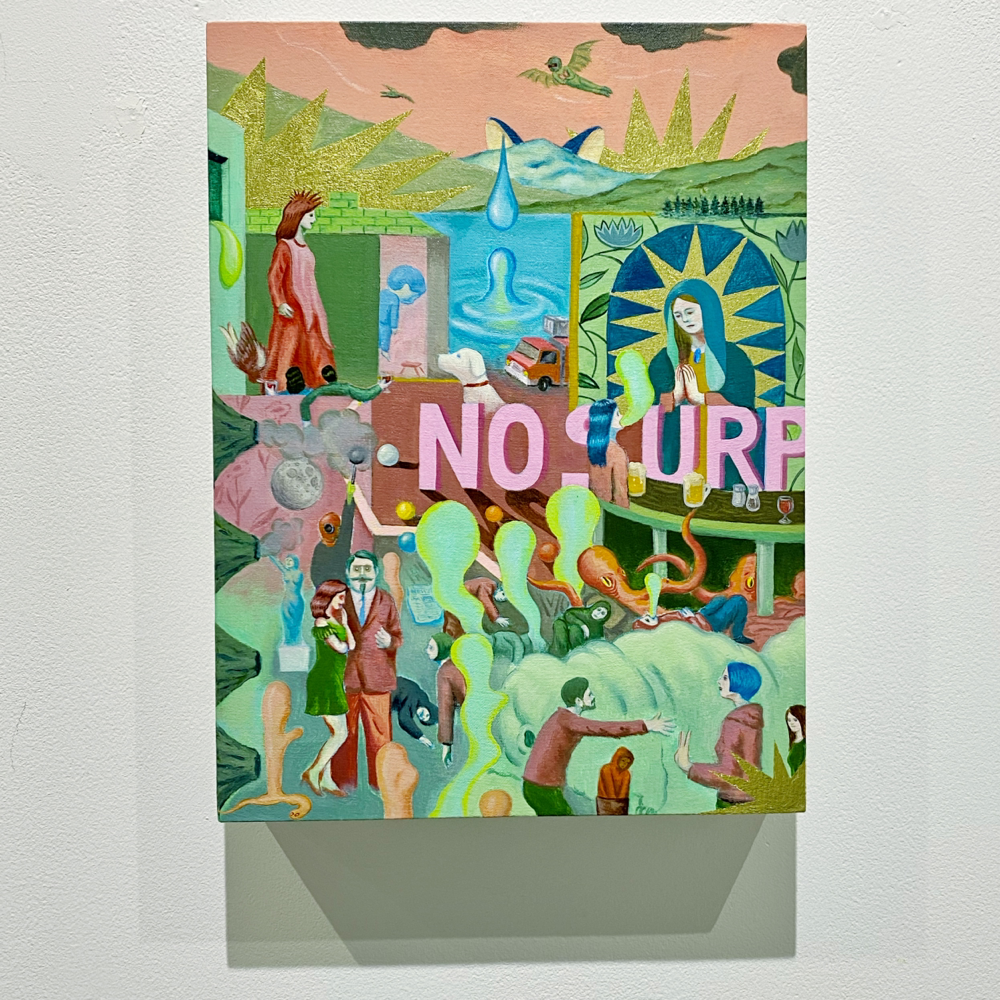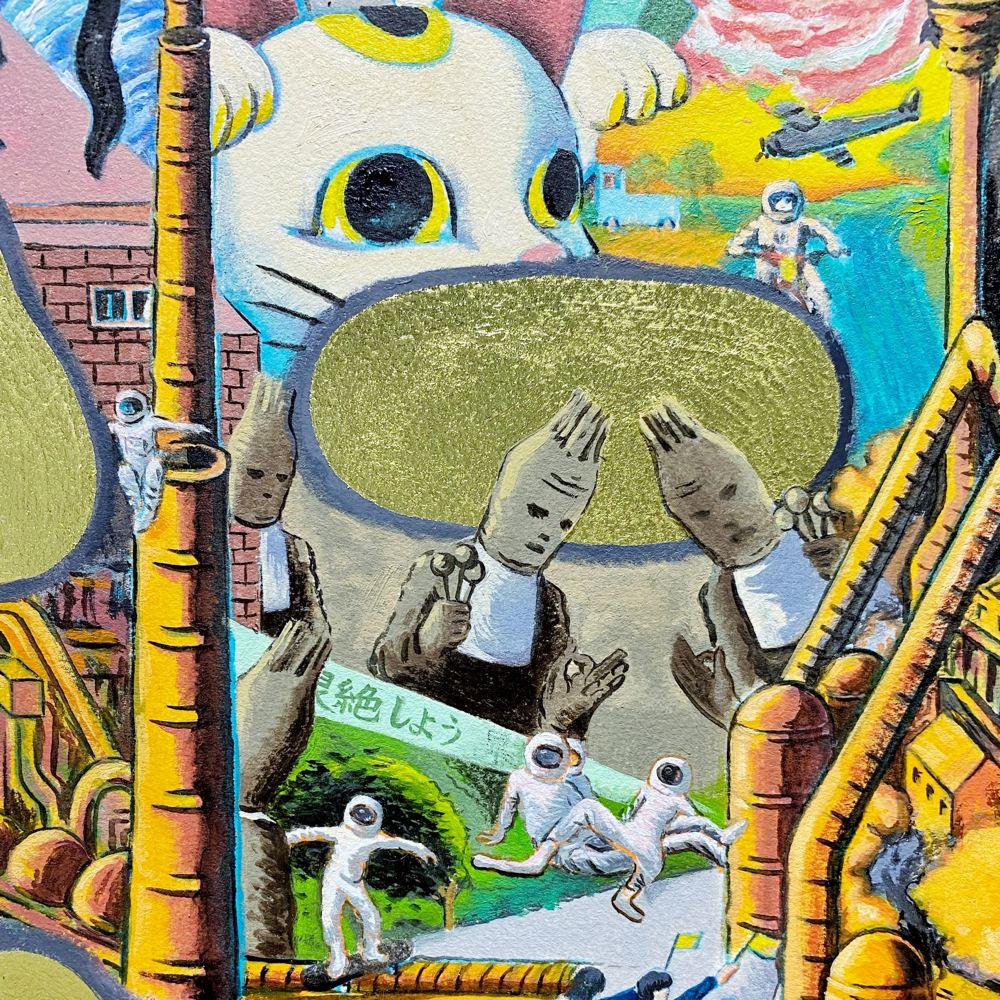 本展「風の強い空と捕虫網と虫眼鏡」では、日常的に集積された視覚的・聴覚的情報や記憶を再構築し表出した作品群が展示されています。印象に残った事物を、一度メモのような簡単なものに置き換え、後からその記憶を呼び起こすというプロセスを経て描かれた作品群は、ヒエロニムス・ボスの「快楽の園」のような異世界の群像画のようにも、日本のサブカルチャー誌の表紙に見られるような想像上のコミカルな表現にも、遠近法を用いず重要なものを大きく描いた後期ゴシック〜初期ルネサンス期の画家たちの作品のようにも感じられ、人によって受ける印象が異なる不思議な世界観を形成しています。
