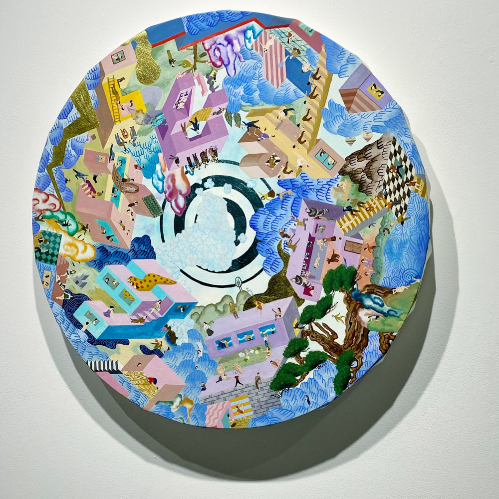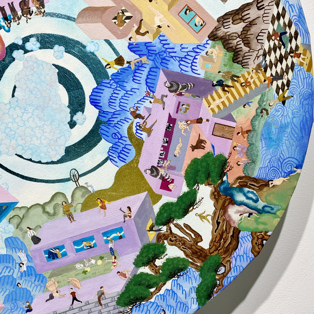 細かい表現が見られます。こちらの作品は直径 61cm 。雲や松、金箔など日本的や表現も見られますが、描かれている人物が細かくて、しかも意味不明な行為をしていたりします。1つ1つじっくり観て楽しい。