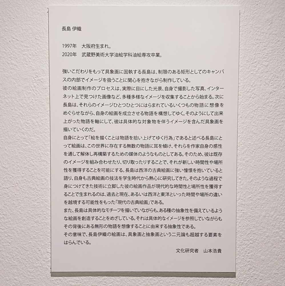 長島伊織さんは1997年生まれ、武蔵野美術大学油絵学科油絵専攻卒業。卒業後より多くの個展やグループ展で作品を発表されています。SNSで初めて作品を拝見し、切り取られた何気ない風景、ということに留まらない何か惹かれるものがあって、ずっと印象に残っていました。今回「Another Film」を鑑賞し、その理由を探ってきました。