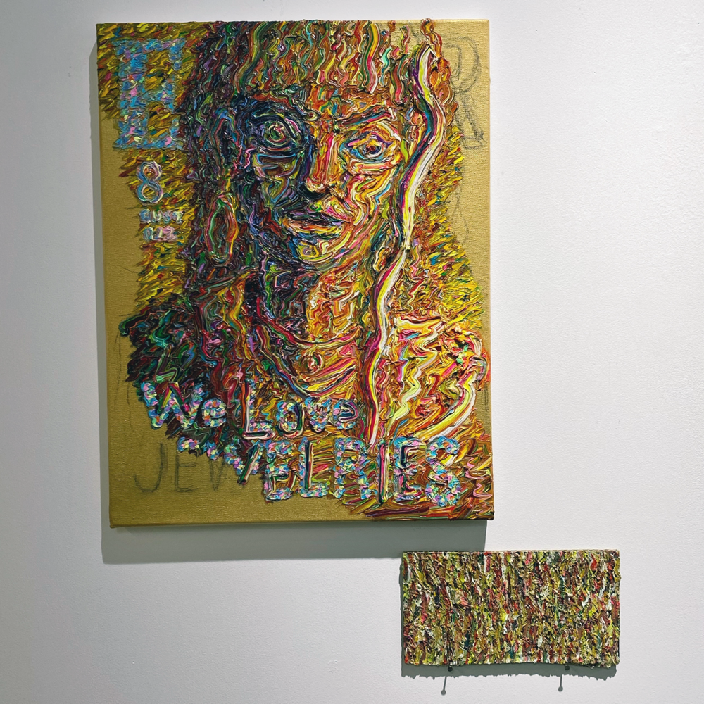 We Love JEWERIES というゴージャス感、、、というよりは人物の顔、目力の強さに引きつけられます。右下に展示されている混沌としたエネルギーのような一片と比べると明らかに異なる「気」の流れがあるようです。モデルのエネルギーと、文字も含めたレイアウトのエネルギーもあるのかな、と思いました。人物自体は、どこか、いにしえの時代の職人風に見えるのはなぜだろう、、、?