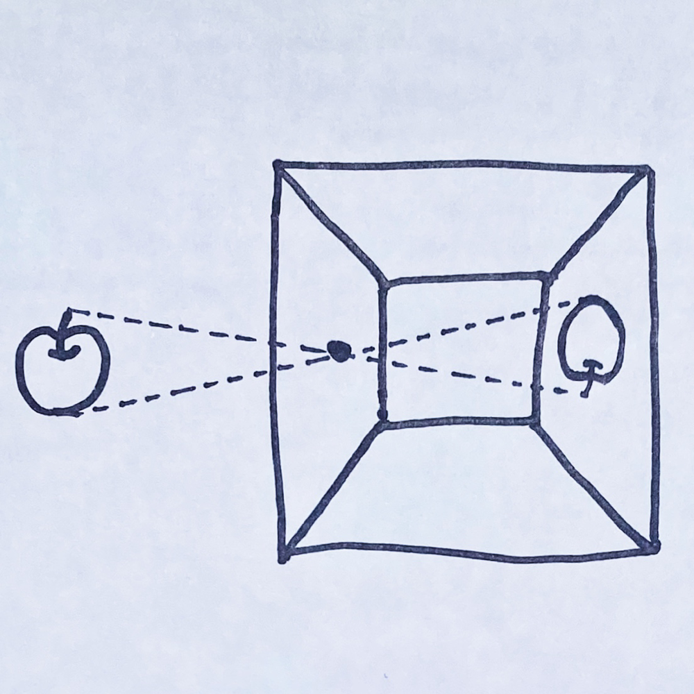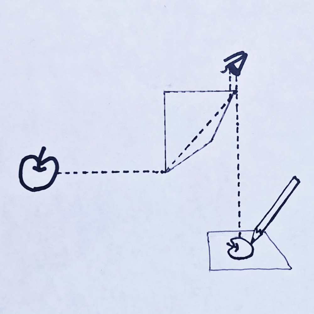 カメラ・ルシダ (ラテン語で「照らされた部屋」の意) とは、画家がスケッチをする際の補助器具として先行して用いられていたカメラ・オブスクラ (ラテン語で「暗い部屋」の意) の 対 を意識して命名された、描画用補助器具のことです。カメラ・オブスクラは、原始的なものはその名の通り、暗い大きな箱のような部屋に小さい穴をあけ反対側の面に映った像を描き写す、というピンホールカメラの原理を用いた装置でした。ヨハネス・フェルメールもカメラ・オブスクラを用いて下絵を制作していたと言われています。反対に、カメラ・ルシダには実は「部屋」と呼べるような構造は無く、45°に傾けた半透明の鏡 (マジックミラー) を通して紙の表面を見下ろすと、反射した正面の風景と真下の紙とが目の前で重ね合わさって見え、それをそのまま紙の上にトレース出来るという仕組みです。
