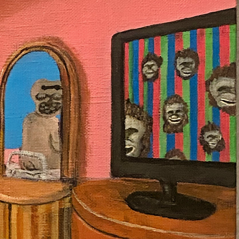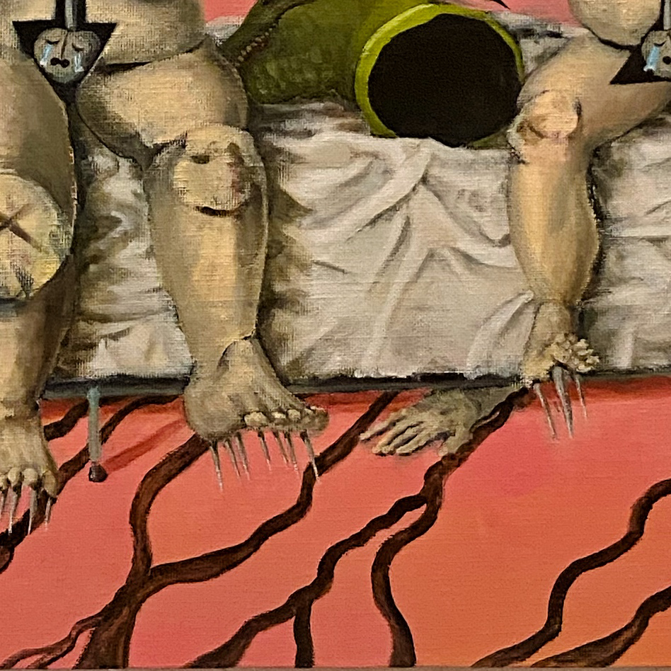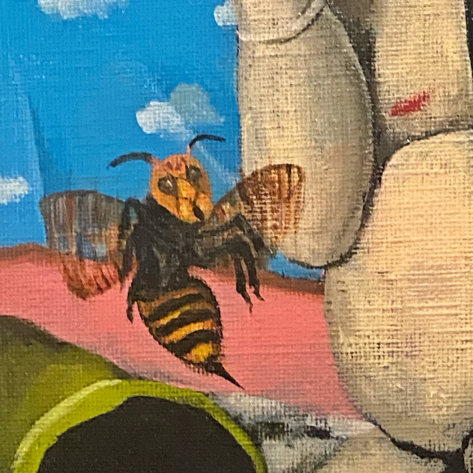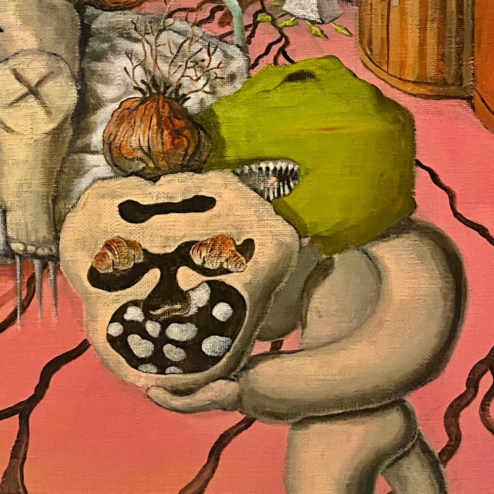 「爬虫類の頭部、猿の尻尾、玉ねぎを載せた人間の頭部を持つ子供、赤い入口か出口に閉じ込められた人間、感情を司る器官である股間は号泣しており、したたる練乳が天井から与えられたりして、体の中心に仕掛けられた針はいつか喉元に刺さる予定で、液晶テレビのモニターにはやはり猿が映し出され、観葉植物はいつも逆さに置かれて、汚水はずっと出続けるけど、とにかく今のところはススメバチがとんでもなく怖い。」(部分拡大)