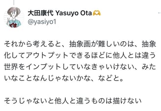 最後に私の持論を紹介したいのですが、見えている世界をとことん見つめ尽くさなければ抽象画を描くことは出来ない、と考えています。