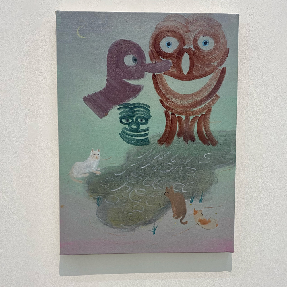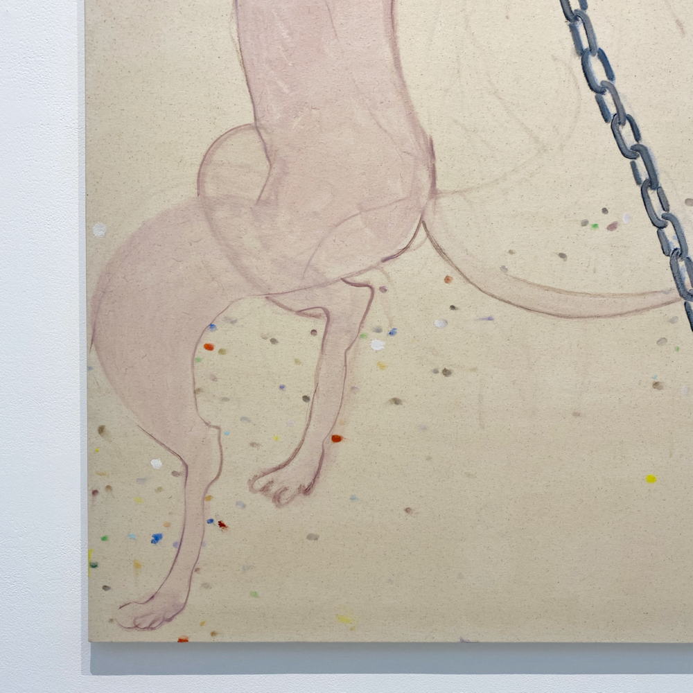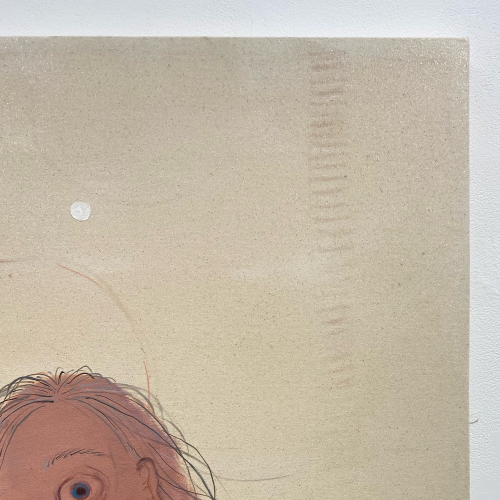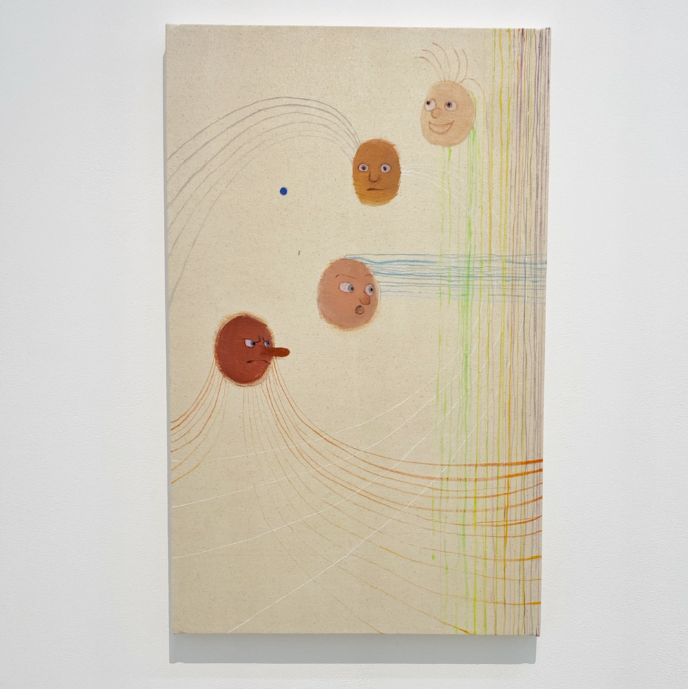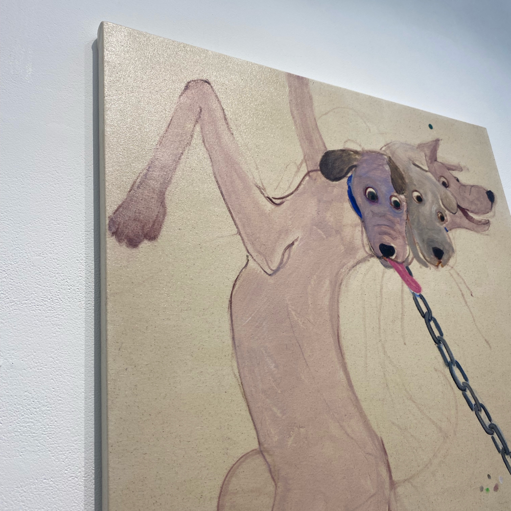 南谷さんと言えば「犬」という気もしますが、これは普通に見たらケルベロスかなと思いつつ、どこかそうじゃない感もあります。同じ犬の別の顔?なのか、顔の犬種もそれぞれ違うみたいだけど、同じ犬が首を振っているアニメーションにも見える。1つなのか無限なのか、哲学的な問いを突きつけられているような? キャンバス地そのままといった背景が羊皮紙の色にも思えて、未だ解読されていない中世の写本の挿絵を見ているような感じも受けました。