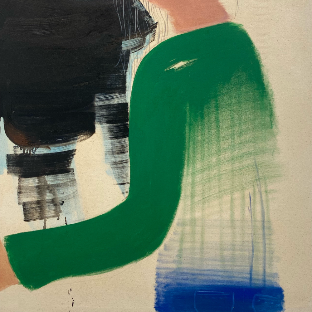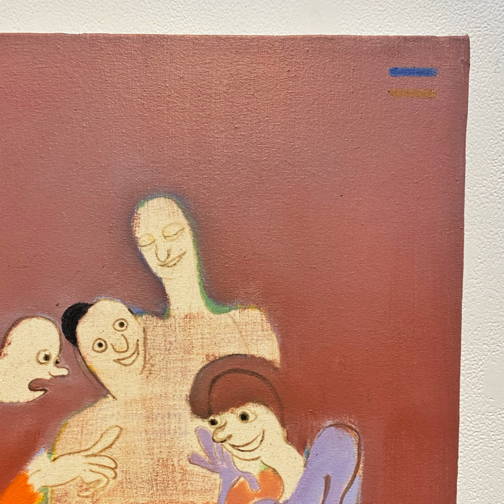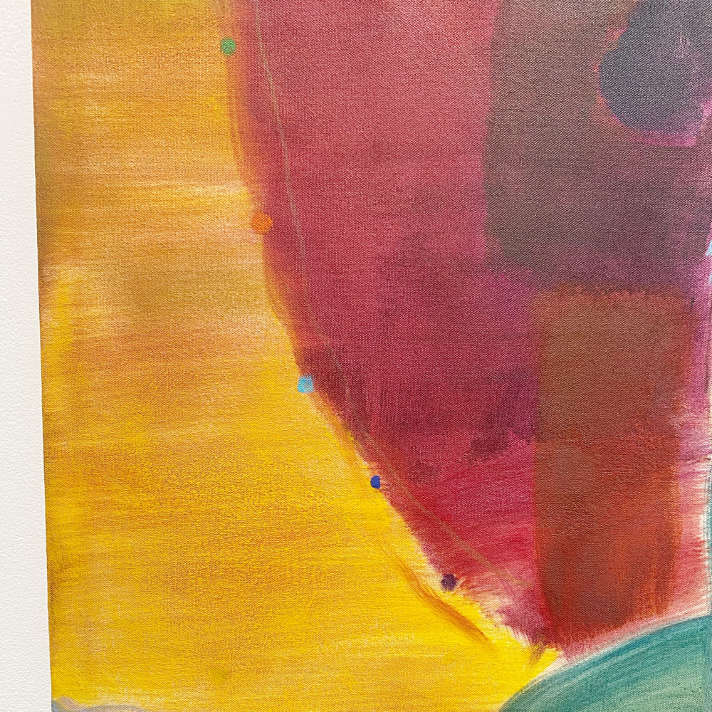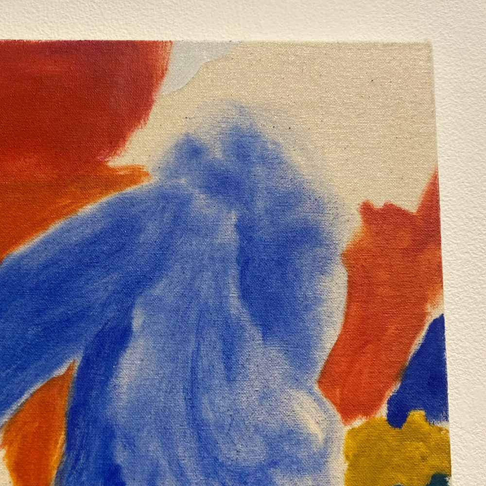 色校正のような2本の色の線が右上にあります。たったこれだけの分量の絵の具が乗っているか乗っていないかだけで画面全体が変わって感じる。「絵」というものの深淵。