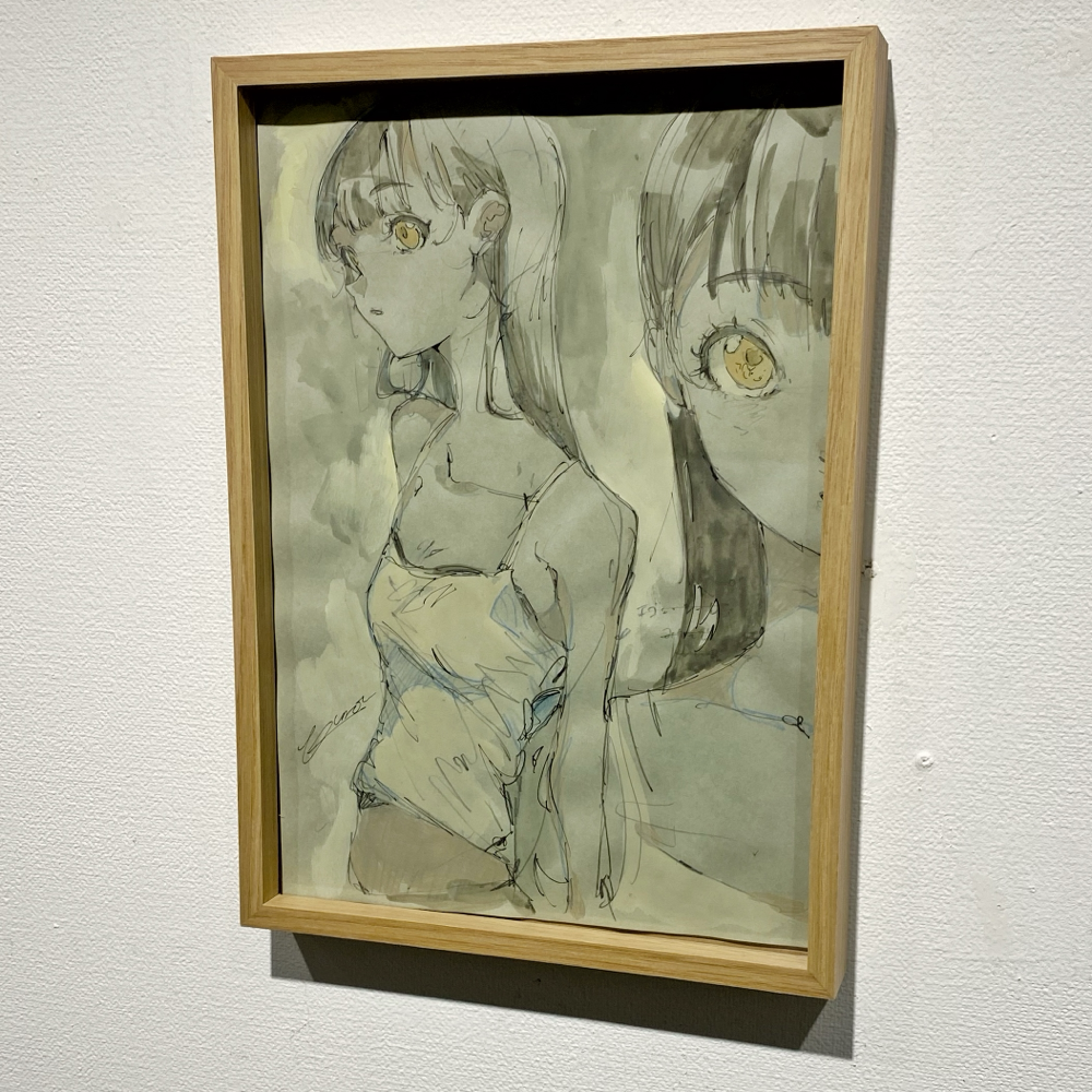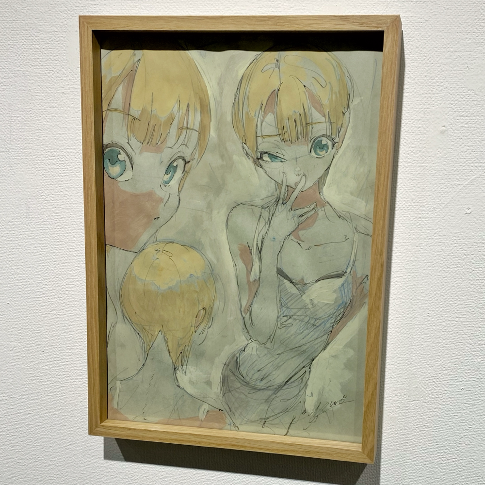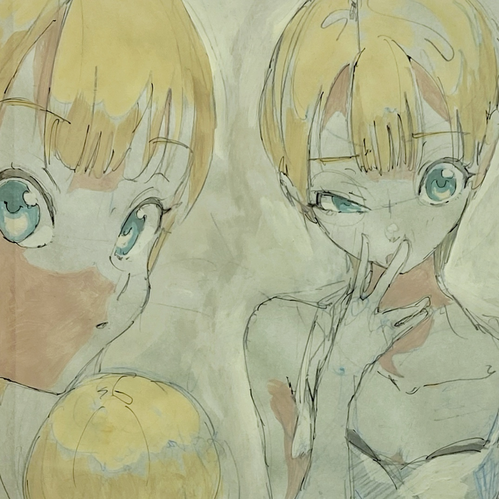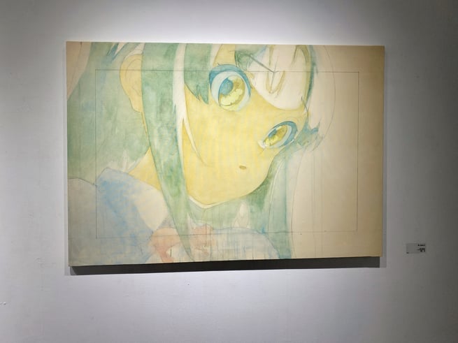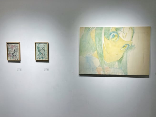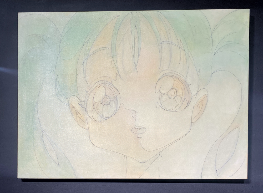 ここで展覧会タイトルの「PROCESS」の意味が明らかになりました。アニメキャラクターの設定集のようなドローイング群や、油彩の下描き段階で用いられる「おつゆ描き」の時点のようなキャンバス作品は「過程そのもの」を表している、と捉えることが出来ます。