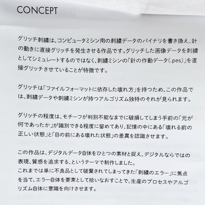 本記事でも「壊れている」という表現をしましたが、「グリッチ刺繍」は私たち人間からすると「壊れている」ように見えます。記事の冒頭で画像掲載させていただいた「CONCEPT」にも