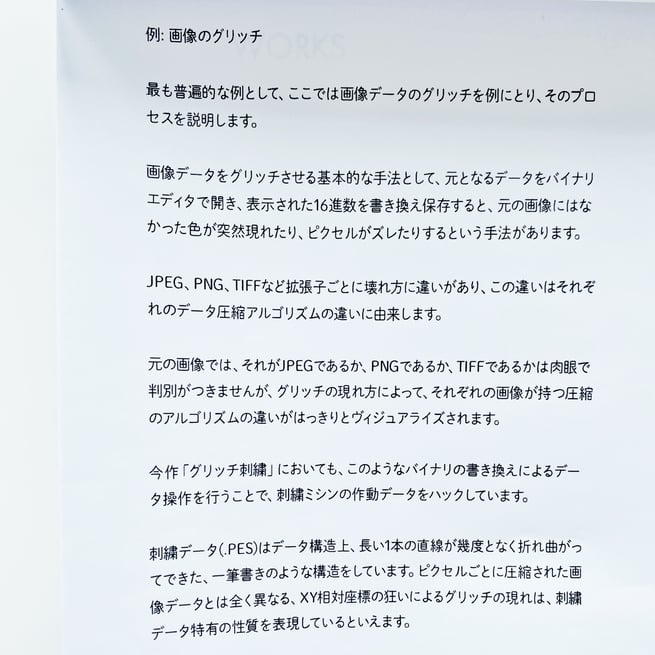 この「グリッチ刺繍」に関する話題だけを取り上げてもかなり色々なことが語れそうなのですが、まずは、本展「KEY WORKER」の展示作品とそのステートメントを掲載します。