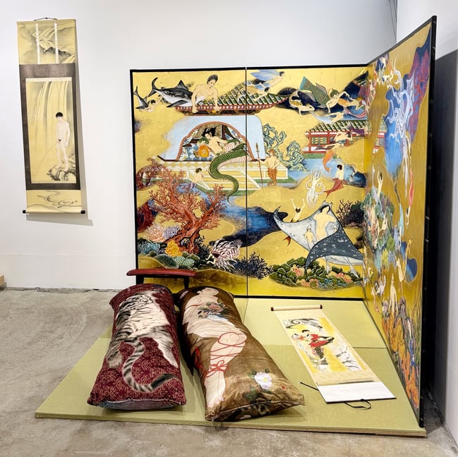 美術の歴史の中で裸体の画題として選ばれてきたのは "女性" 、というイメージが強いです (実際に男女どちらのヌードが多いのか厳密にわからないのでこんな言い方ですが。なお、ゲリラ・ガールズによる1989年の有名な風刺ポスター "Do women have to be naked to get into the Met. Museum?" 女性がメトロポリタン美術館に入るには裸にならないといけないのか? によれば、メトロポリタン美術館のモダンとコンテンポラリー部門で展示されているヌードは85%が女性のヌードとのこと→参照:Met Museum Museums Without Men: Guerrilla Girls。このパーセンテージは2023年に渋谷PARCOで開催されたゲリラ・ガールズの展示では76%になっていました)。ゆえに "官能的な美男" が描かれた木村さんの作品群はフェミニズム的な文脈で語りたくなってしまいますが、、、ひとまずその語りたい気持ちは置いておいてまずは作品を観てみましょー❗️