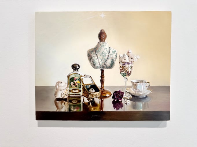 片口さんの写実的な静物画には言葉に尽くせない独特の雰囲気がノっています。それはおそらくそれぞれの物に対する作家自身の思いや時間の積み重ねによるものなのでしょう。本展のタイトル「子供部屋の情景」はシューマンのピアノ独奏曲「子供の情景(kinderszenen)」が由来とのことで、そのことからも、子供時代から作家自身が培ってきた嗜好・価値観が作品群にしっかりと現れているのだと結論づけたいと思います。